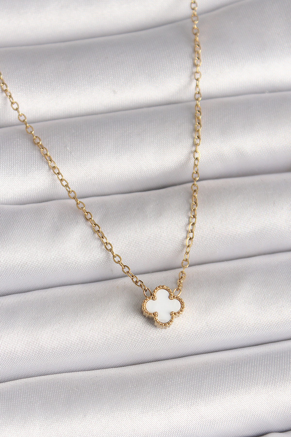 316L Çelik Gold Renk Beyaz Yonca Model Kadın Kolye BKO10019