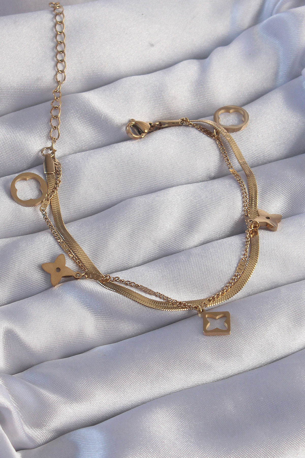 316L Çelik Gold Renk Çift Zincir Yonca Tasarım Bileklik BB6181
