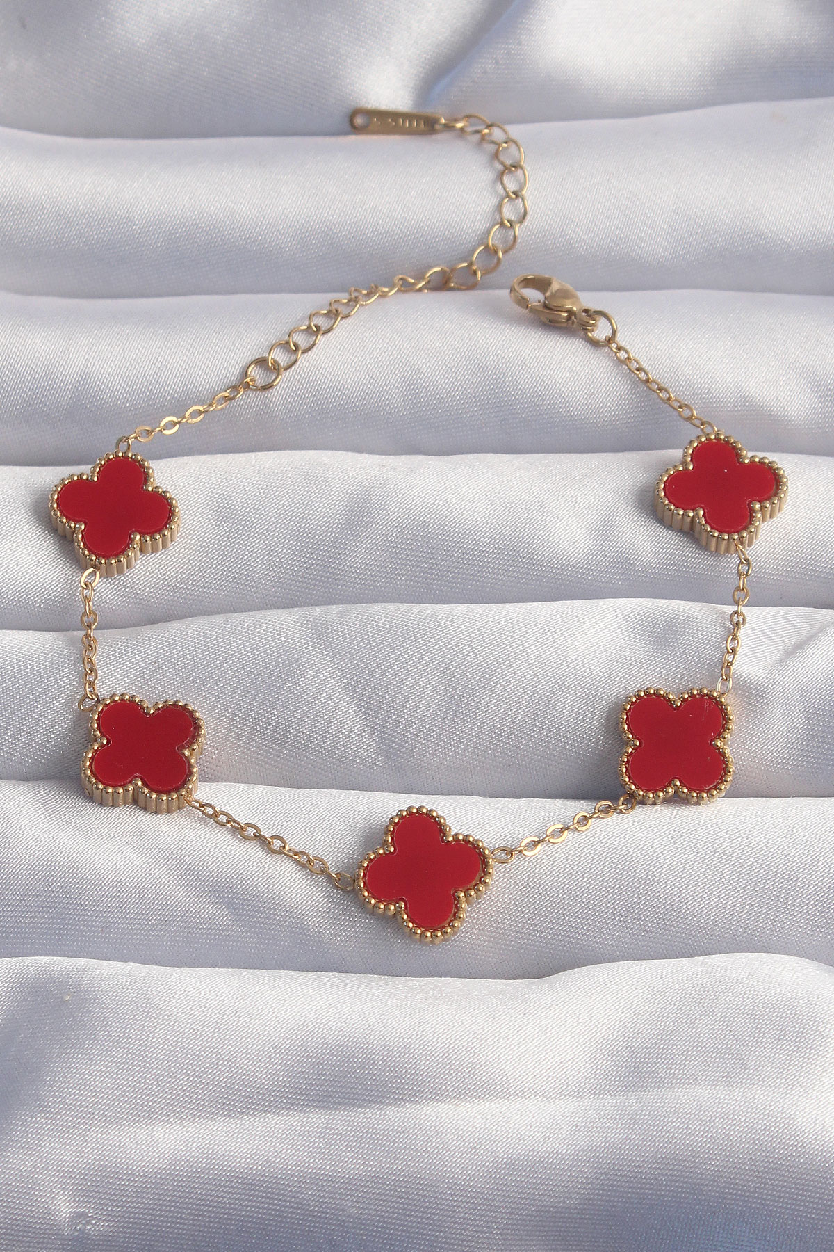 316L Çelik Gold Renk Kırmızı Mineli Yonca Bileklik BB6264