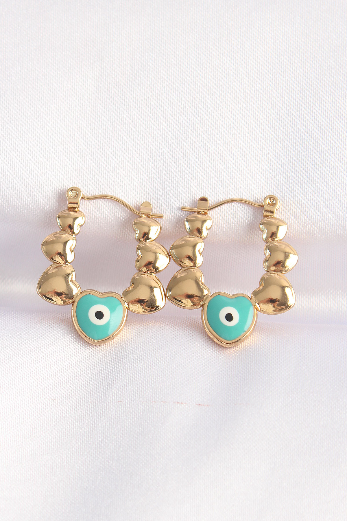 316L Çelik Gold Renk Mavi Nazarlı Kalpli Model Küpe BKP8948