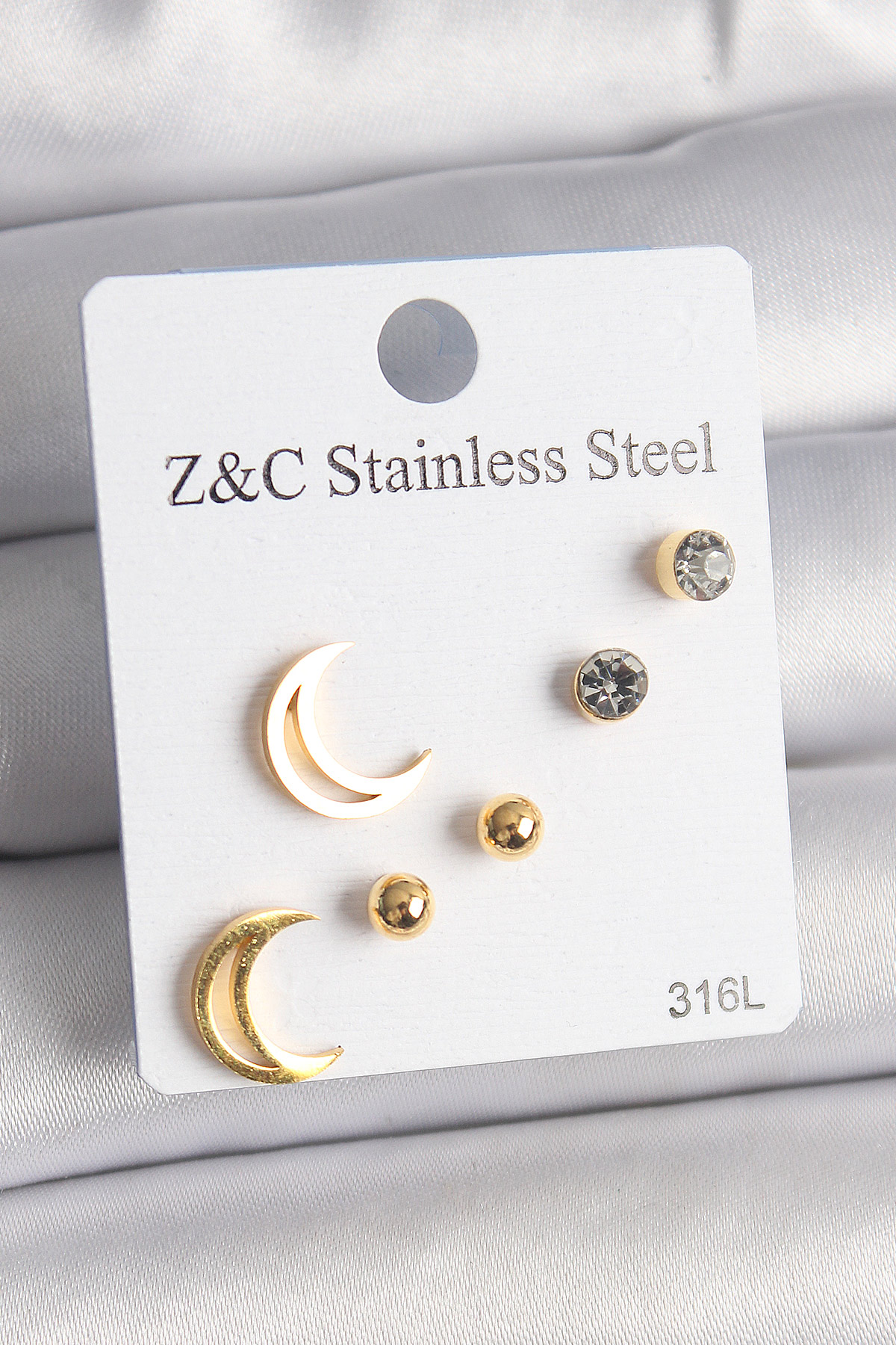 316L Çelik Gold Renk Zirkon Taşlı Hilal Model Kadın Küpe Seti BKP10009