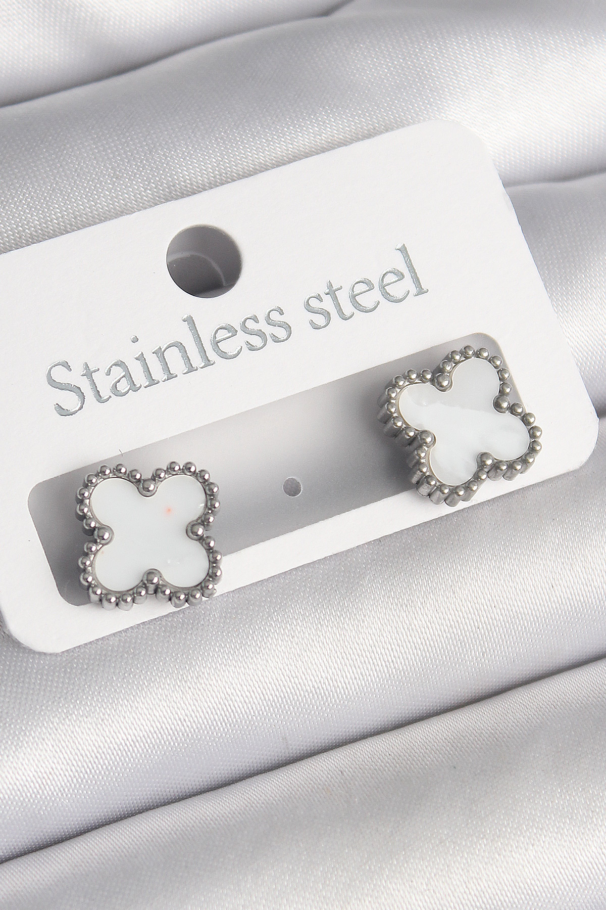 316L Çelik Gümüş Renk Beyaz Yonca Model Kadın Küpe BKP10200
