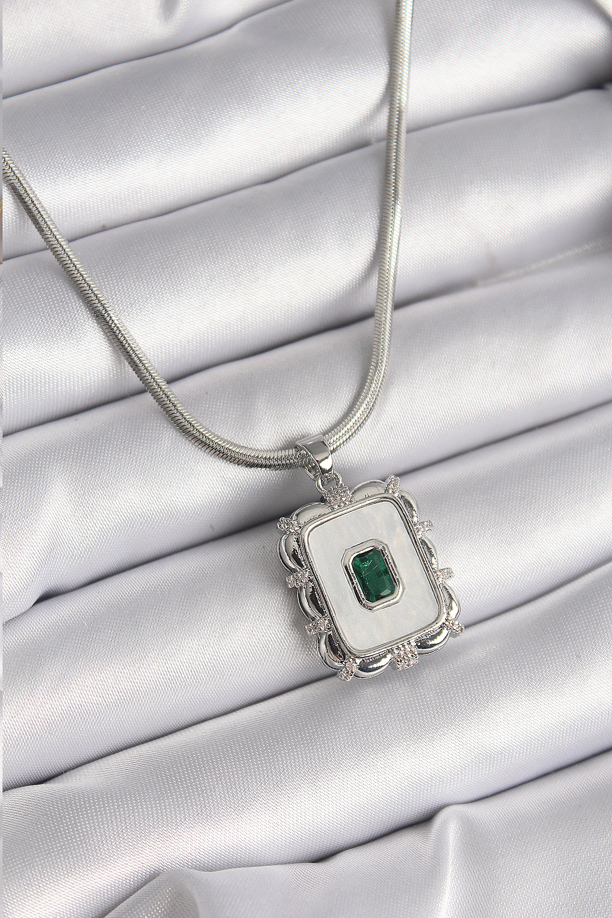 316L Çelik Gümüş Renk İtalyan Zincir Beyaz Sedefli Kare Portre Model Zümrüt Taş Detay Kadın Kolye BKO9596