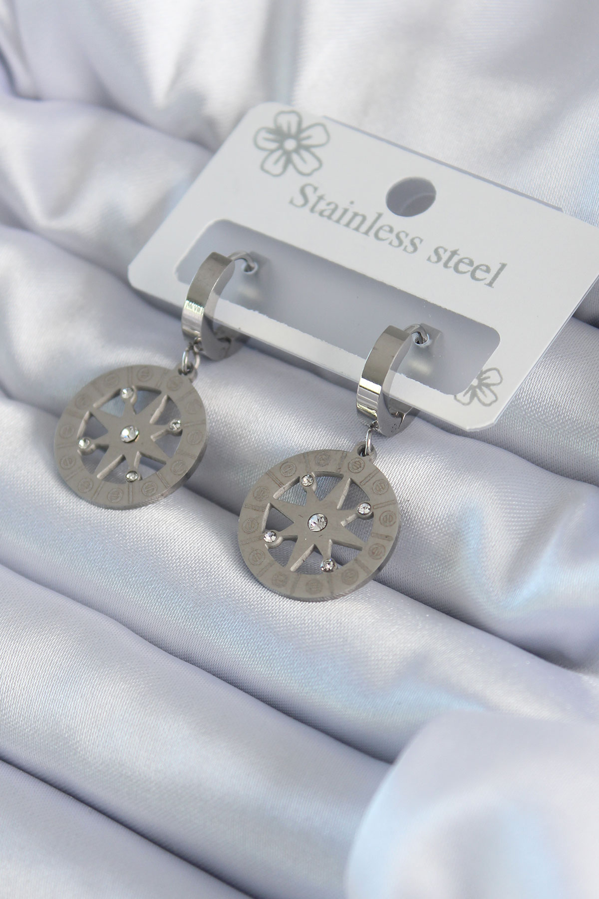 316L Çelik Gümüş Renk Kutup Yıldızı Model Zirkon Taş İşleme Detay Kadın Küpe BKP8064