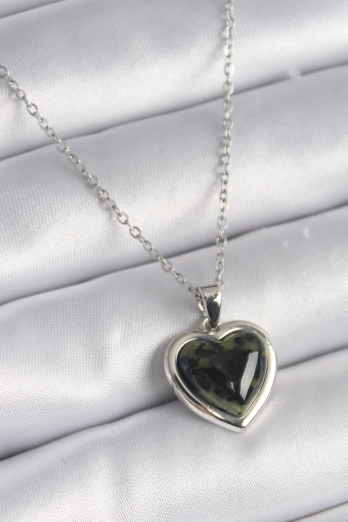 316L Çelik Gümüş Renk Yeşil Mineli Kalp Model Kadın Kolye BKO9526
