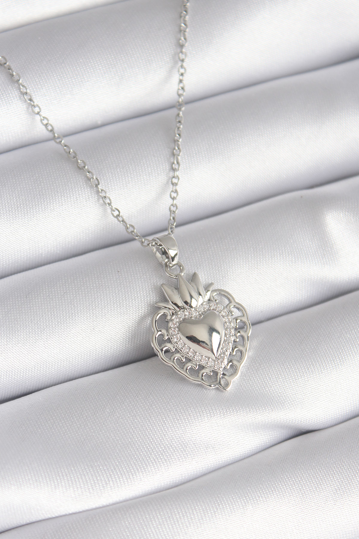 316L Çelik Gümüş Renk Zirkon Taş Detay Taç Kalp Model Kadın Kolye BKO8273
