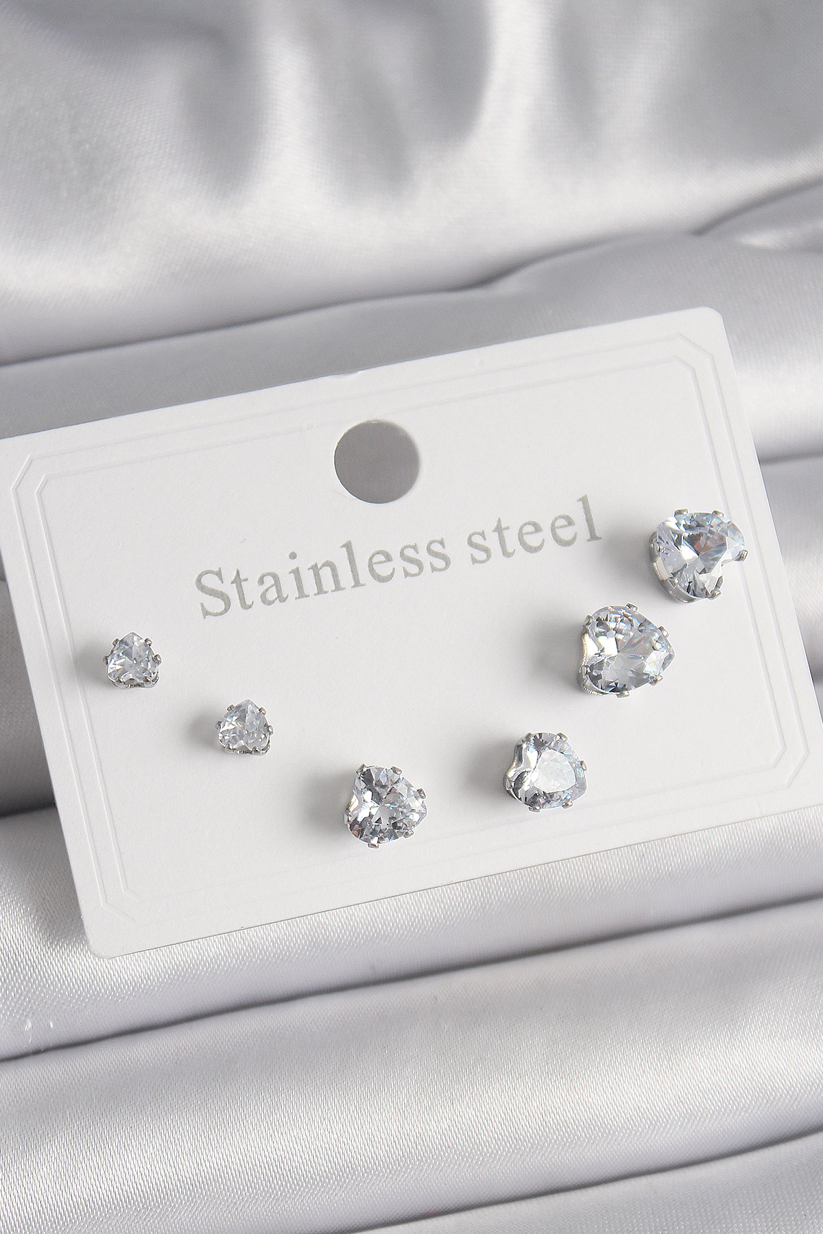 316L Çelik Gümüş Renk Zirkon Taşlı Kalp Model Kadın Küpe Seti BKP9879