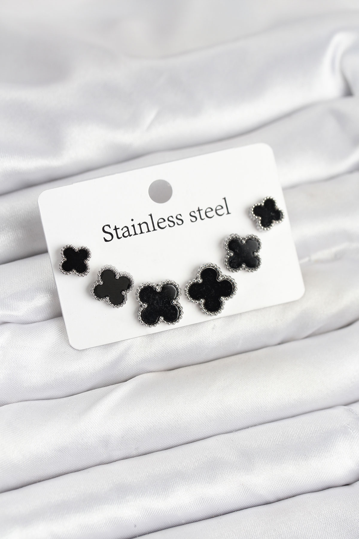 316L Çelik Gümüş Siyah Renk 3 Boy Yonca Küpe Seti BKP11234