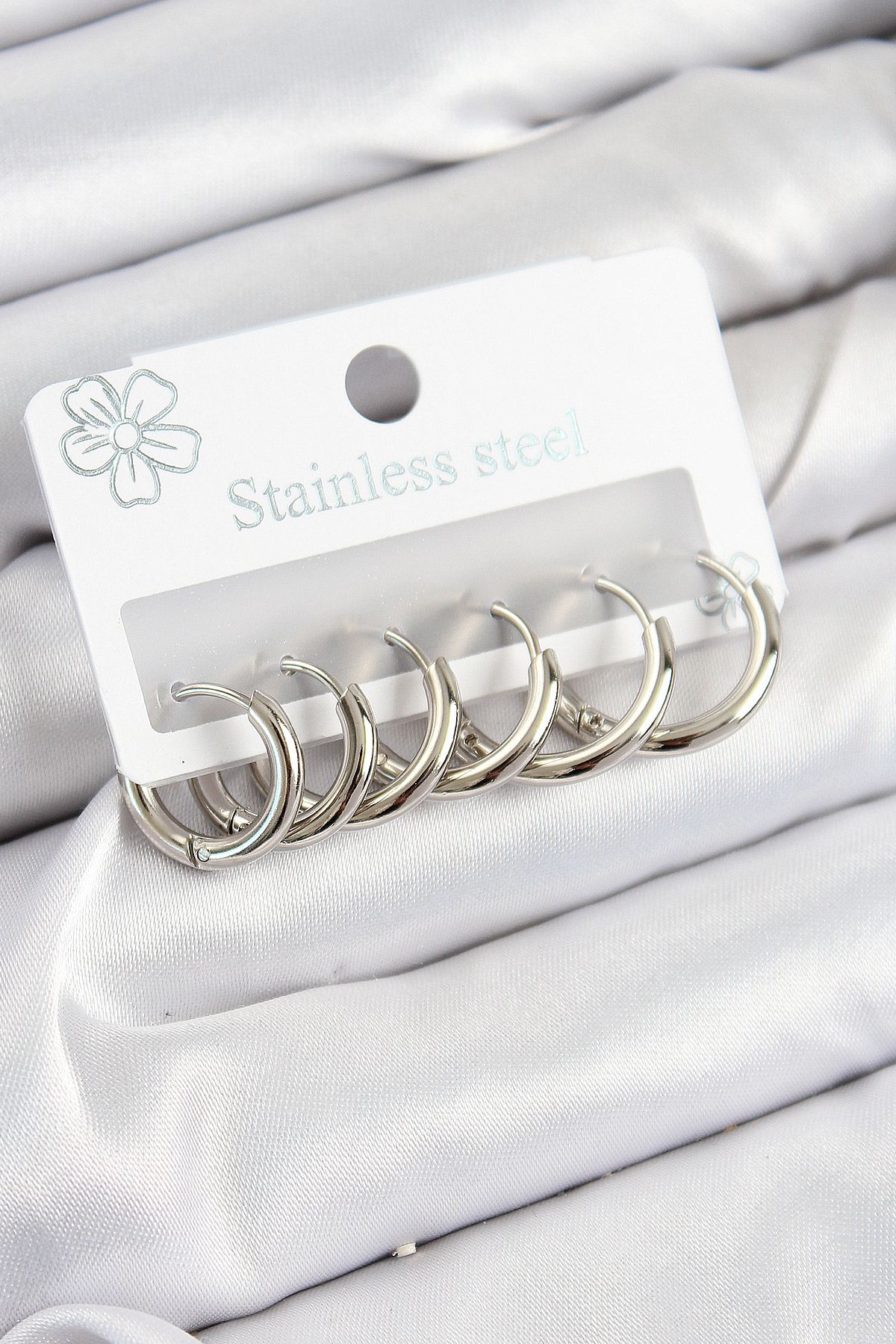 316L Çelik Halka Model Gümüş Renk 3’lü Set Kadın Küpe BKP10984