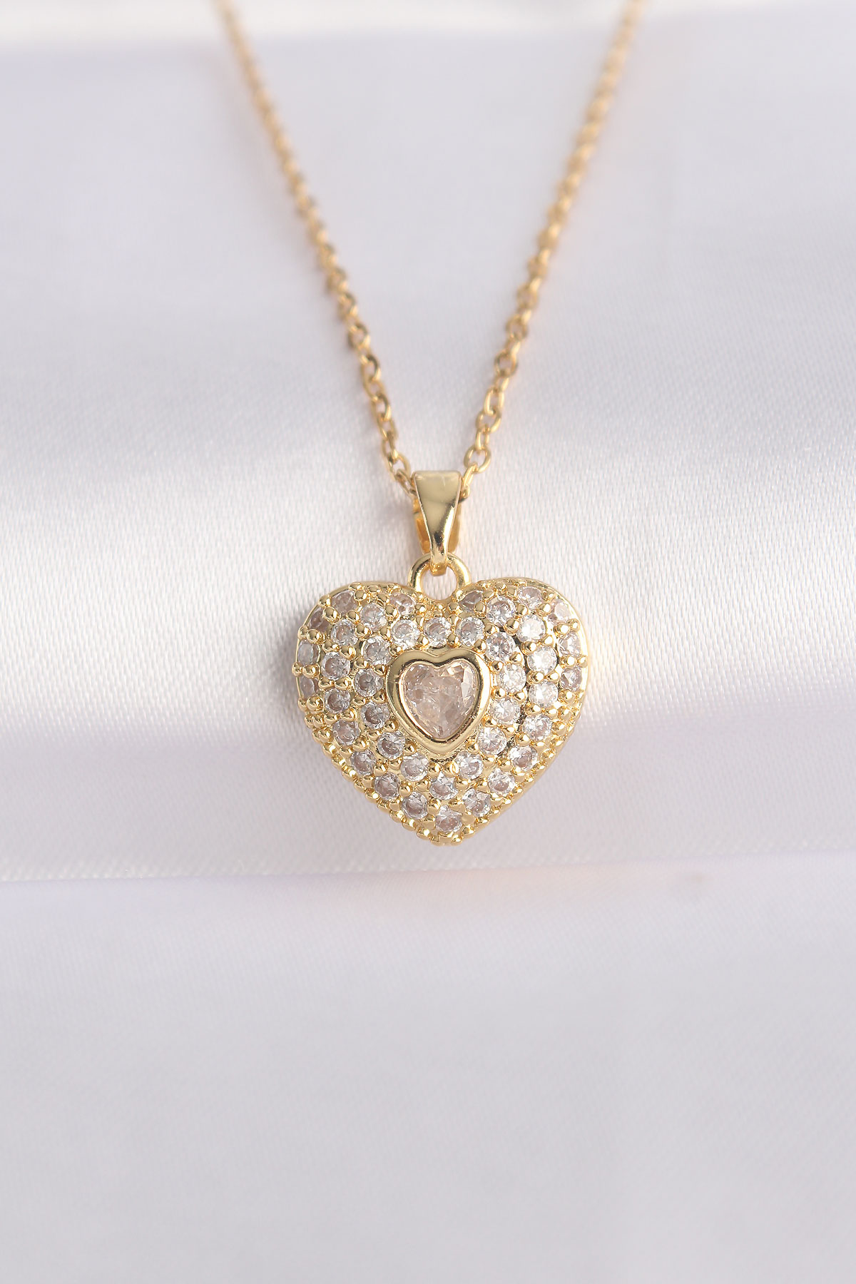 316L Çelik Zincir Altın Renk Zirkon Taşlı Kalp Kolye BKO8624