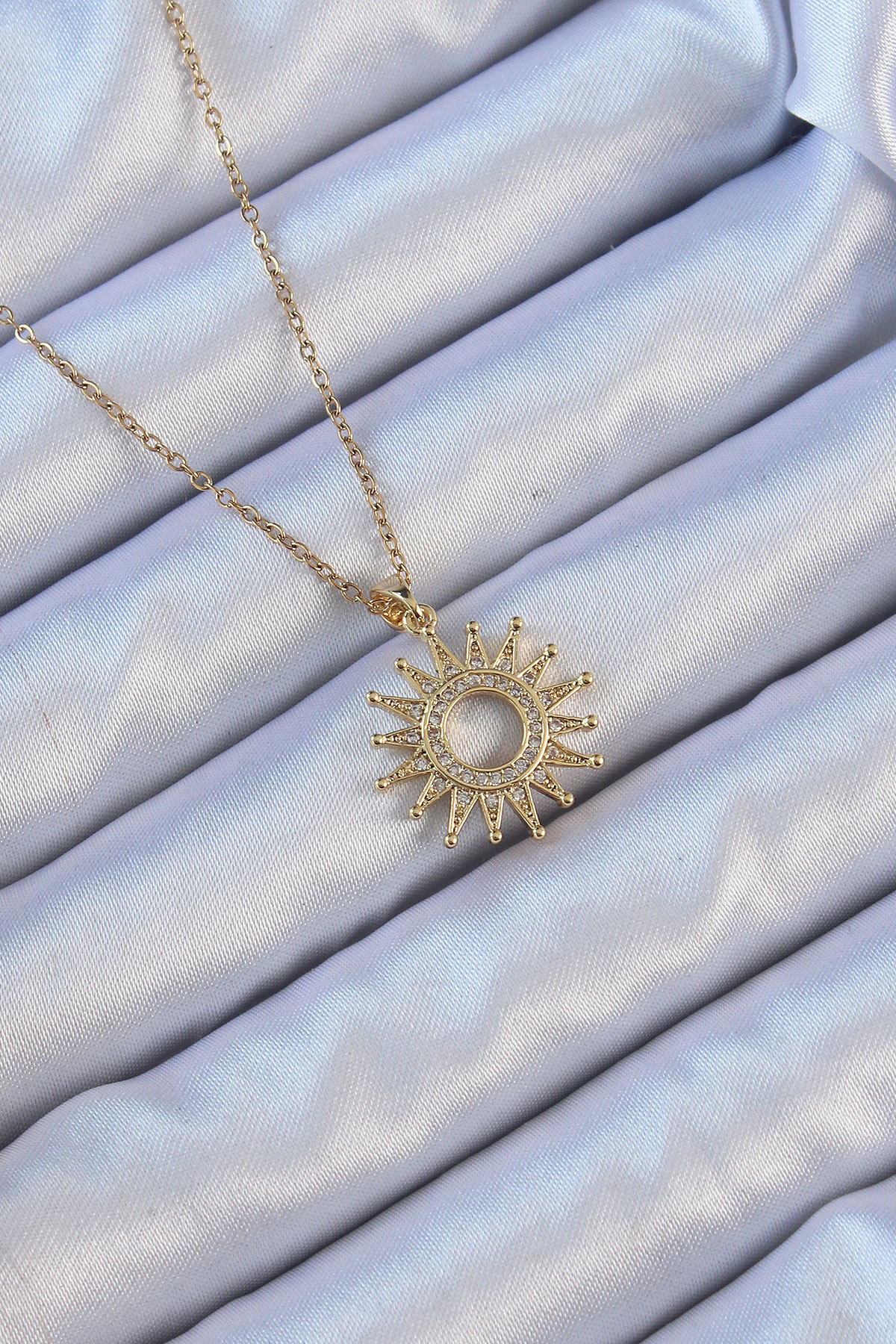 316L Çelik Zincir Altın Renk Zirkon Taşlı Parlayan Güneş Kolye BKO9105