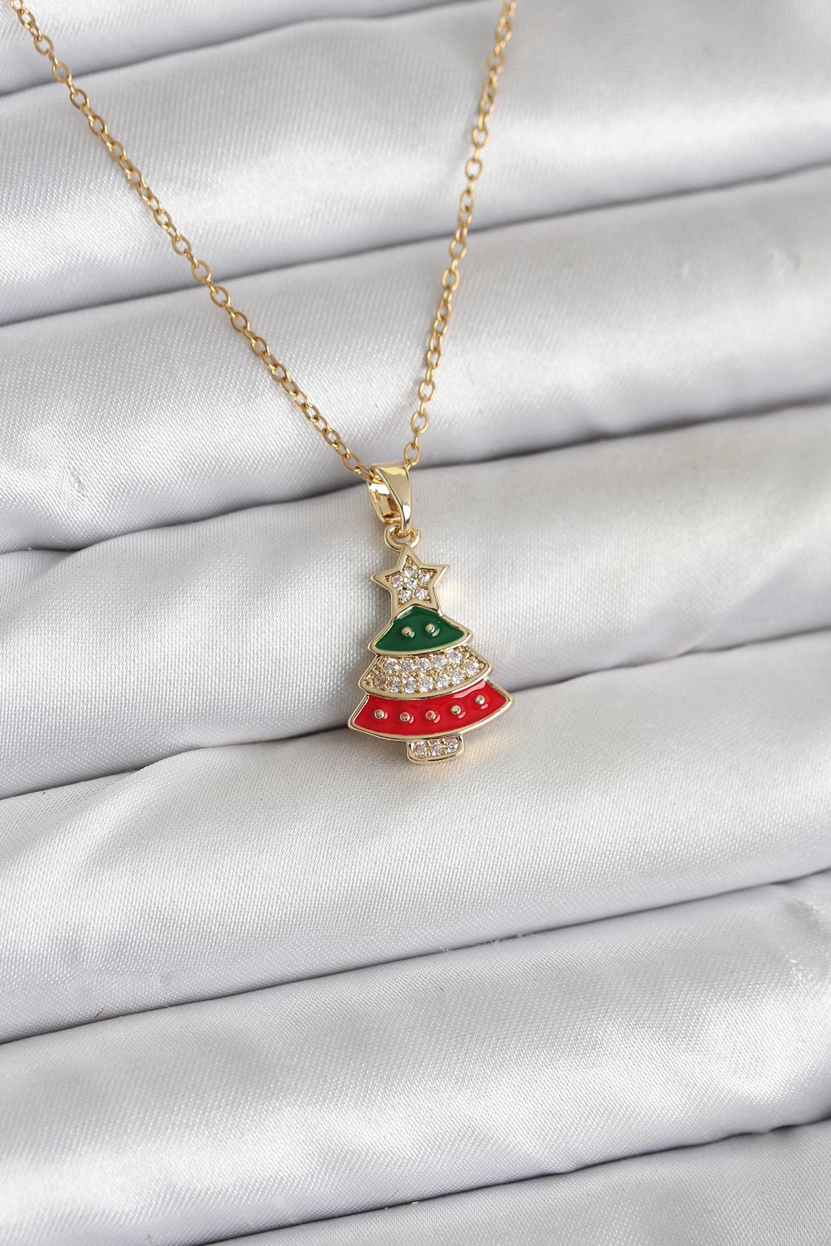 316L Çelik Zincir Gold Ren Çam Ağacı Model Zirkon Taşlı Yılbaşı Temalı Kadın Kolye BKO10710