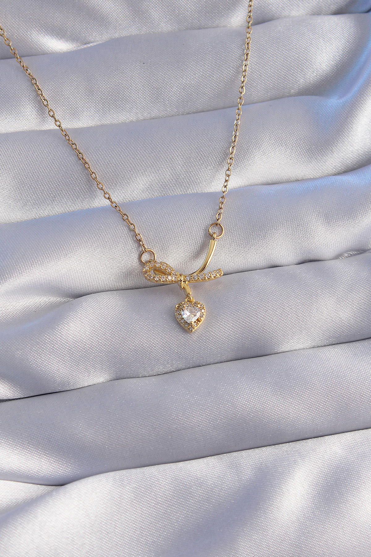 316L Çelik Zincir Gold Renk Zirkon Taşlı Yarım Fiyonk Kalp Kolye BKO8789