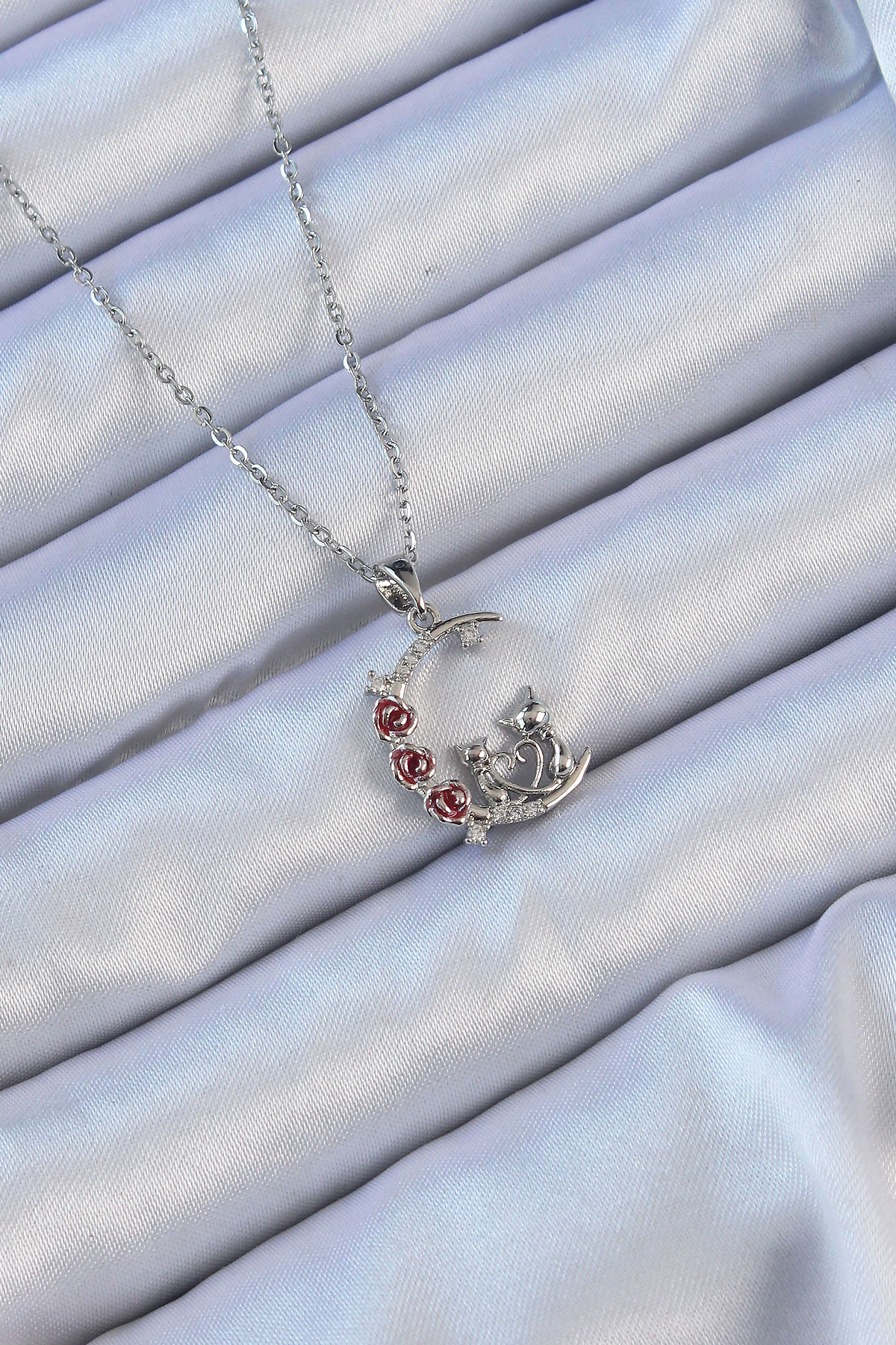 316L Çelik Zincir Gümüş Renk Kırmızı Gül Detay Kedi Figür Zirkon Taşlı Ay Kolye BKO9130