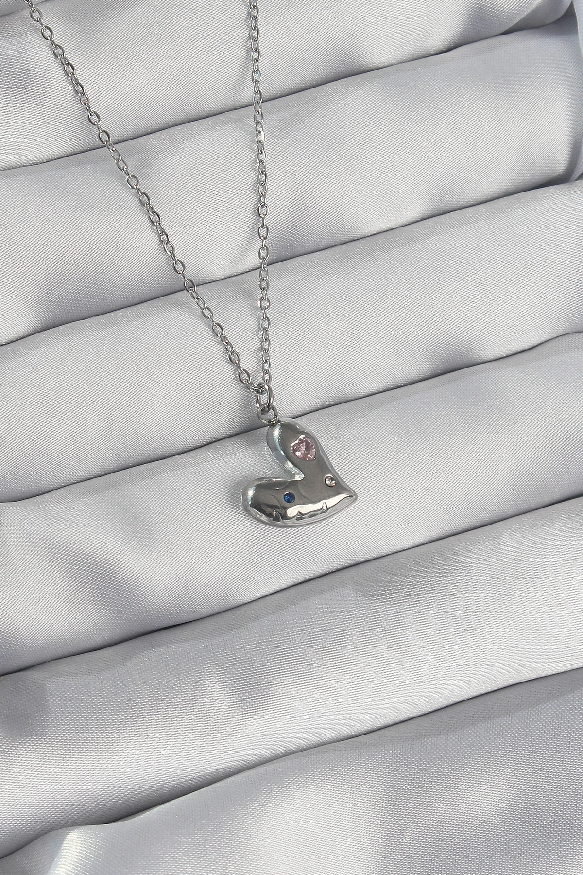 316L Çelik Zincir Gümüş Renk Renkli Zirkon Taşlı Kalp Kolye BKO8906