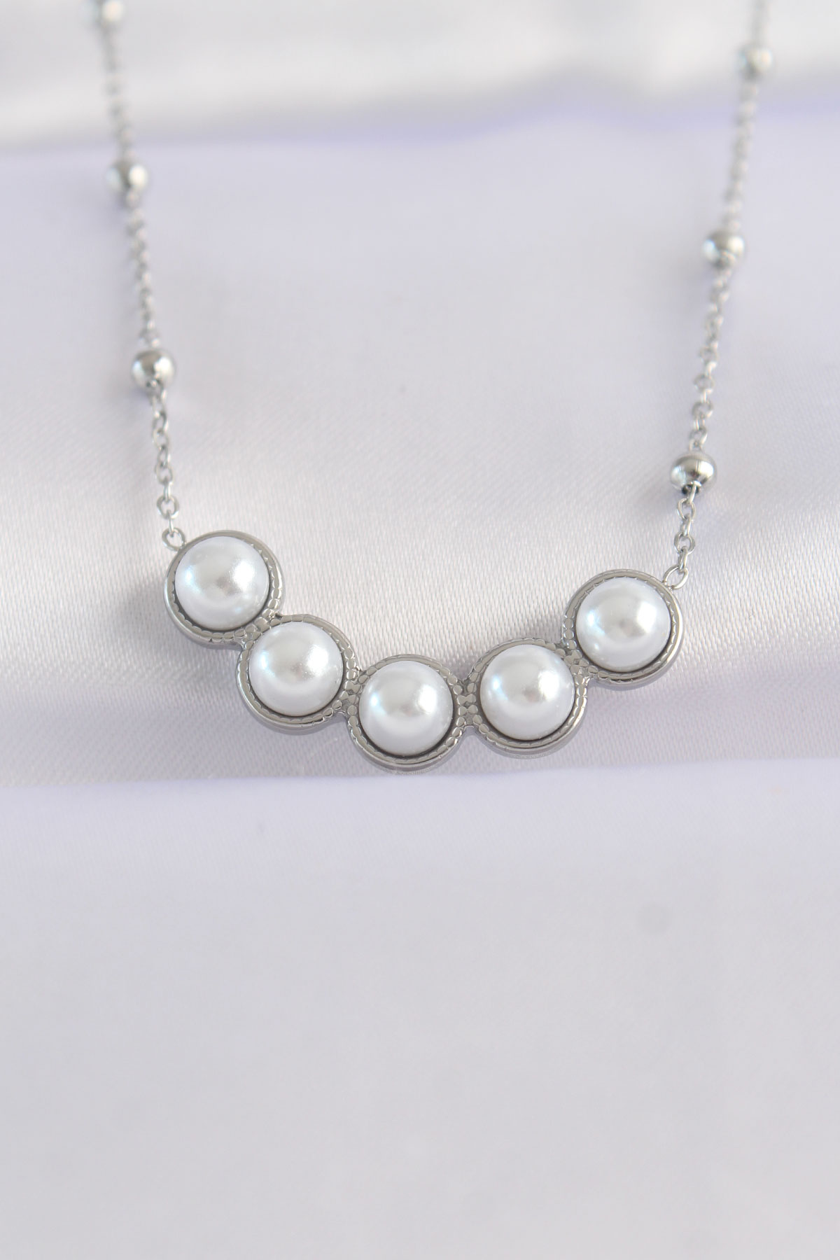 316L Çelik Zincir Gümüş Renk Sıralı İnci Taşlı Kolye BKO8654