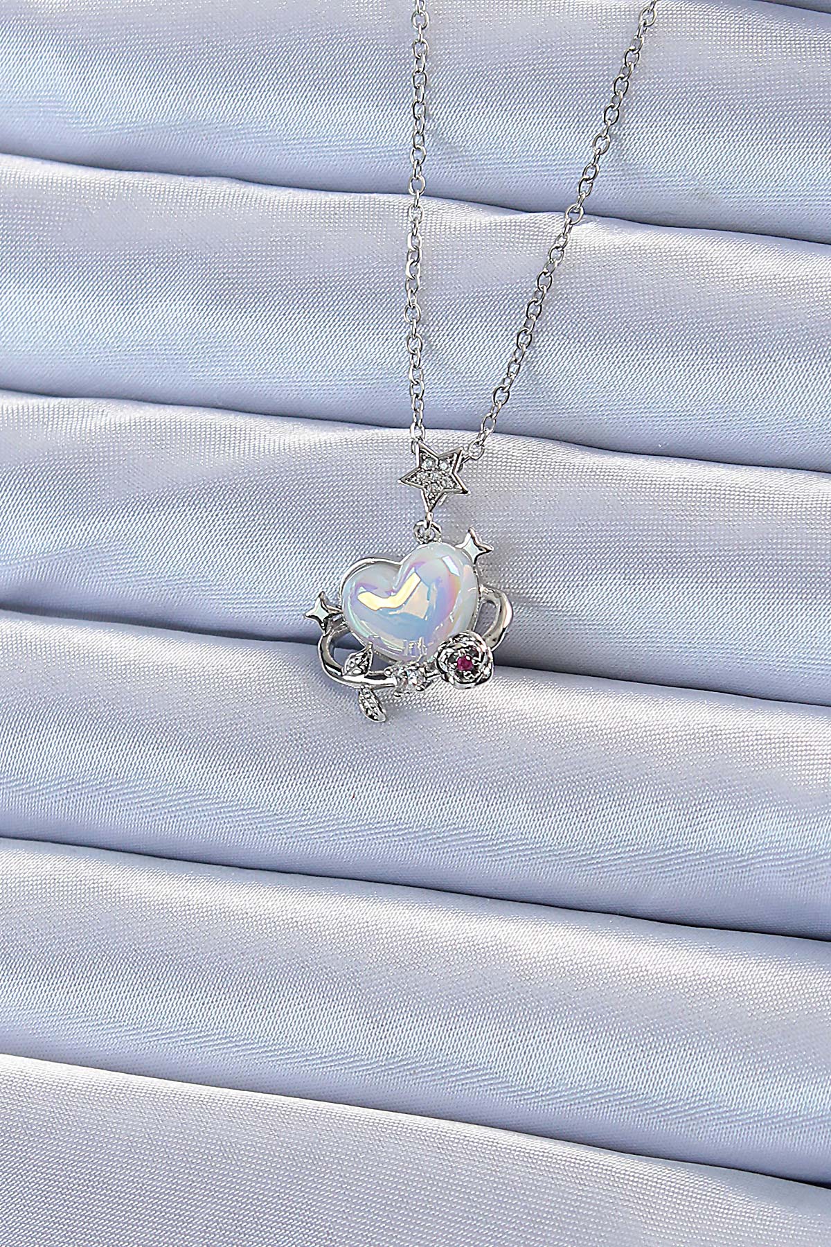 316L Çelik Zincir Gümüş Renk Zirkon Taşlı Gezegen Görünümlü Kalp Kolye BKO9218