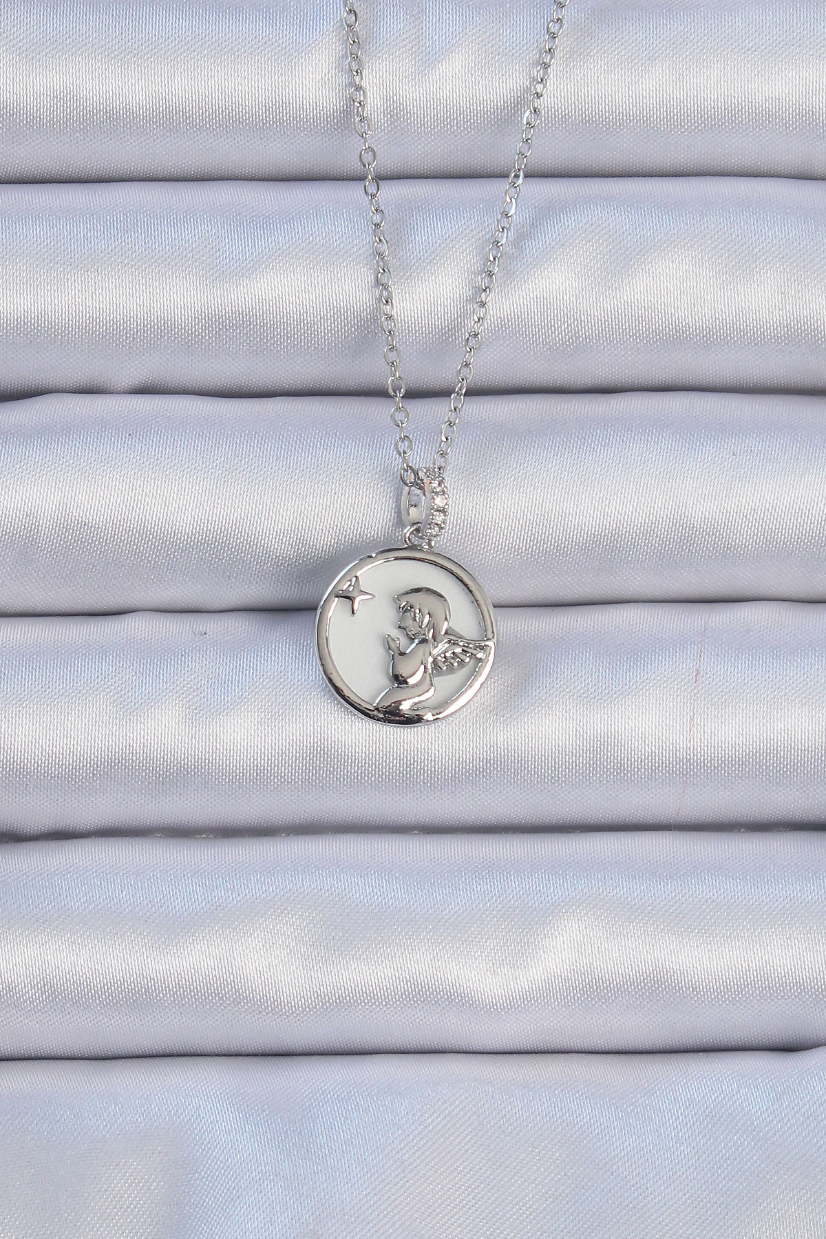 316L Çelik Zincir Gümüş Renk Zirkon Taşlı Mineli Melek Kolye BKO9086