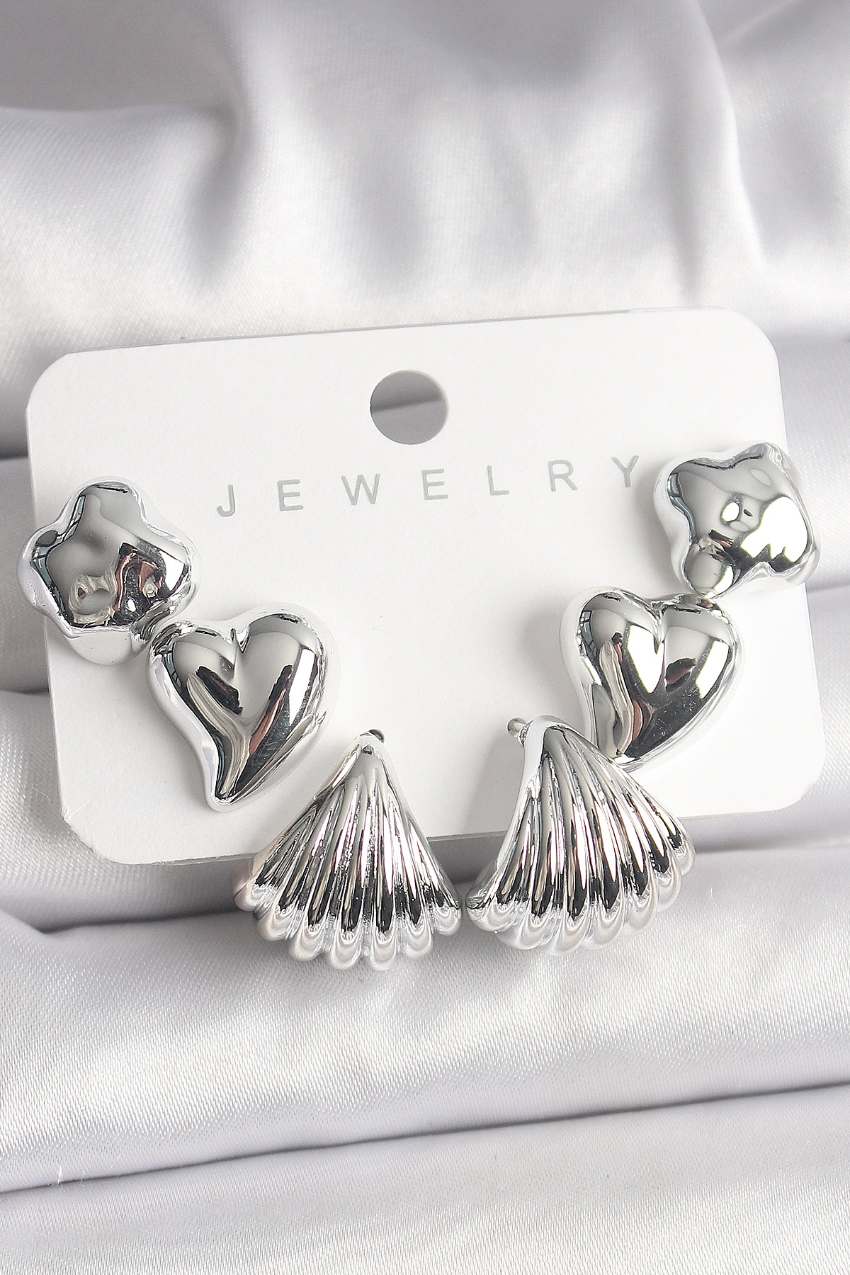 Gümüş Renk Yonca Kalp Deniz Kabuğu Figür CCB Kadın Küpe Seti BKP10021