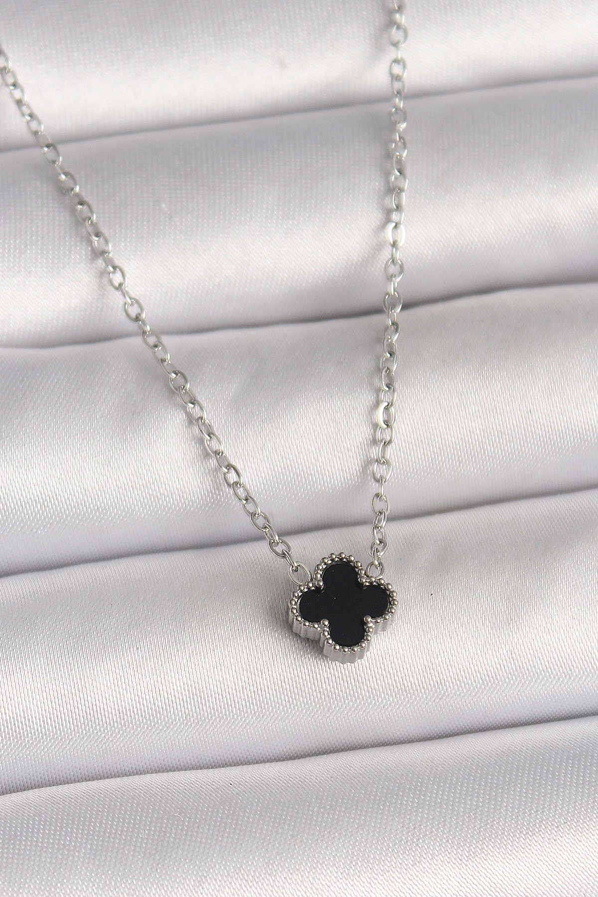 316L Çelik Gümüş Renk Siyah Yonca Model Kadın Kolye BKO10022