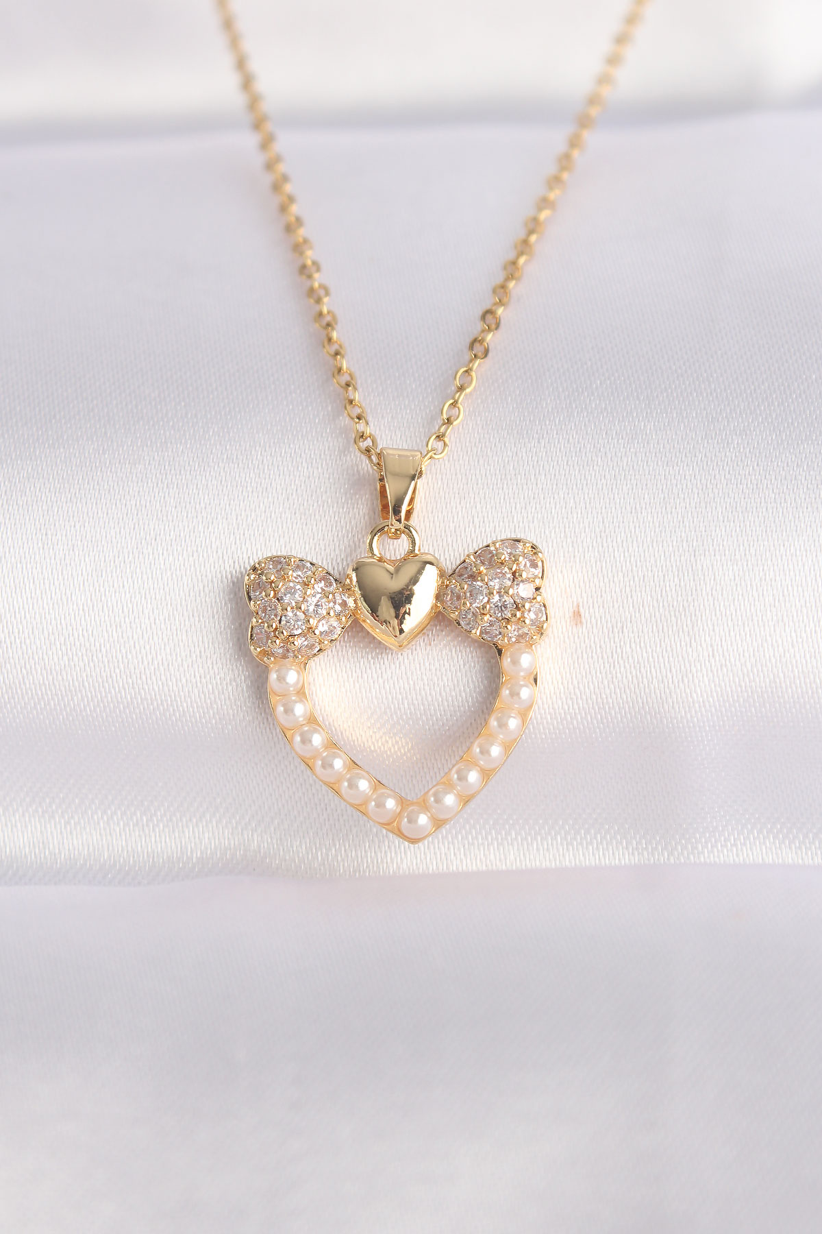 Altın Renk İnci Taş Detay Zirkon Taşlı Kalp Kolye BKO8630
