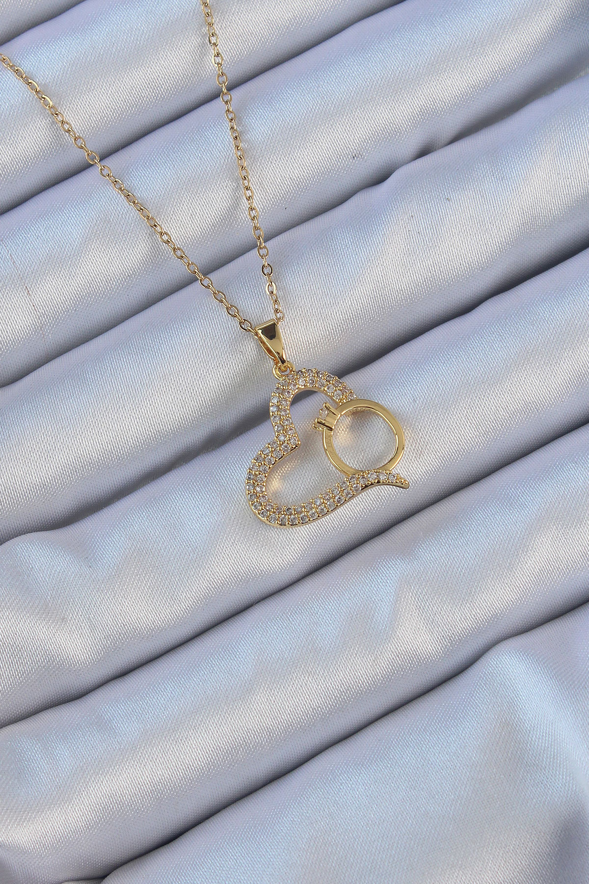 Zincir Altın Renk Zirkon Taşlı Yüzüklü Kalp Kolye BKO9145