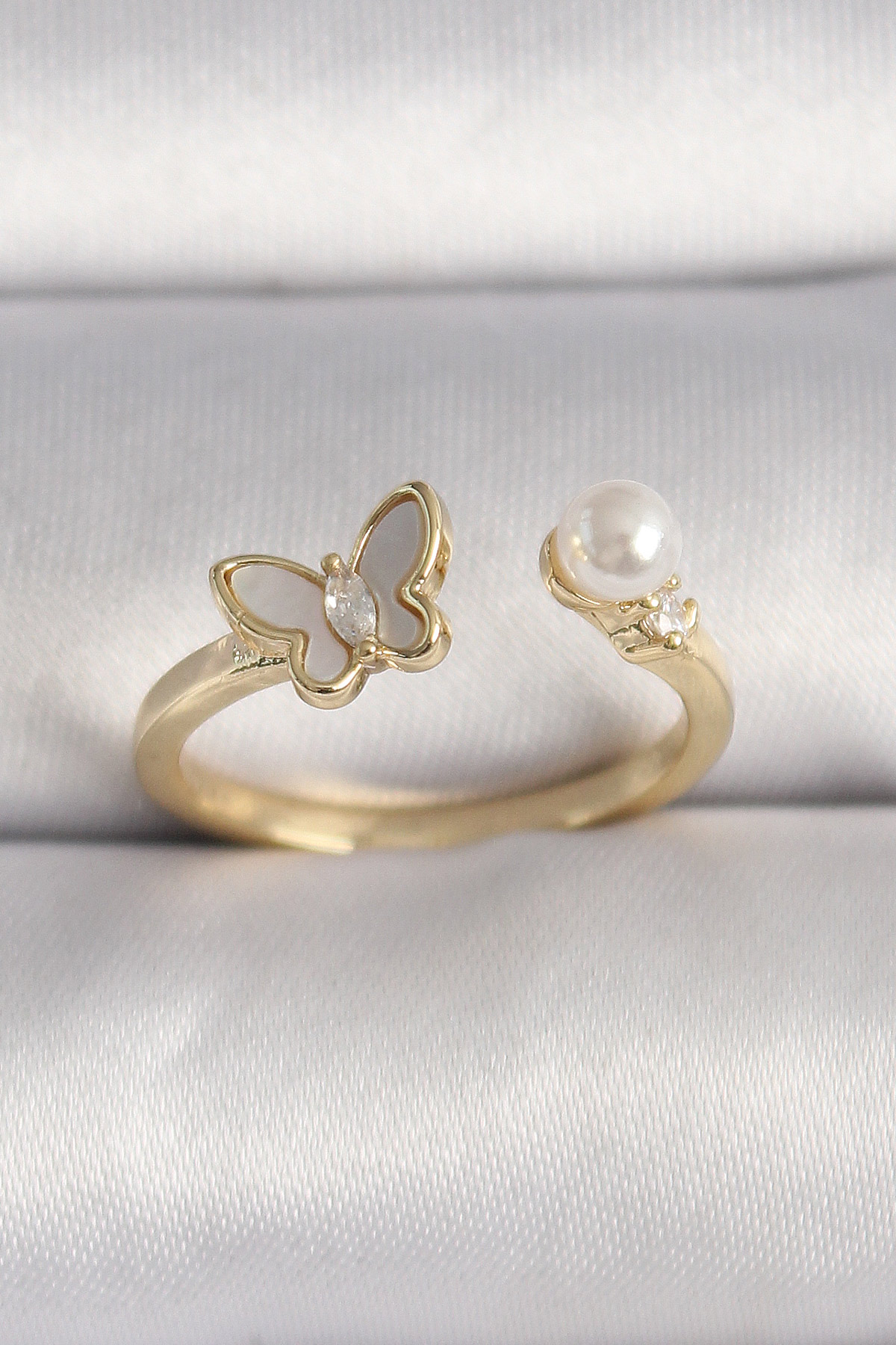 Pirinç Gold Renk Zirkon Taş Detaylı Beyaz Mineli Kelebek Model İnci Detay Ayarlanabilir Yüzük BYK3523