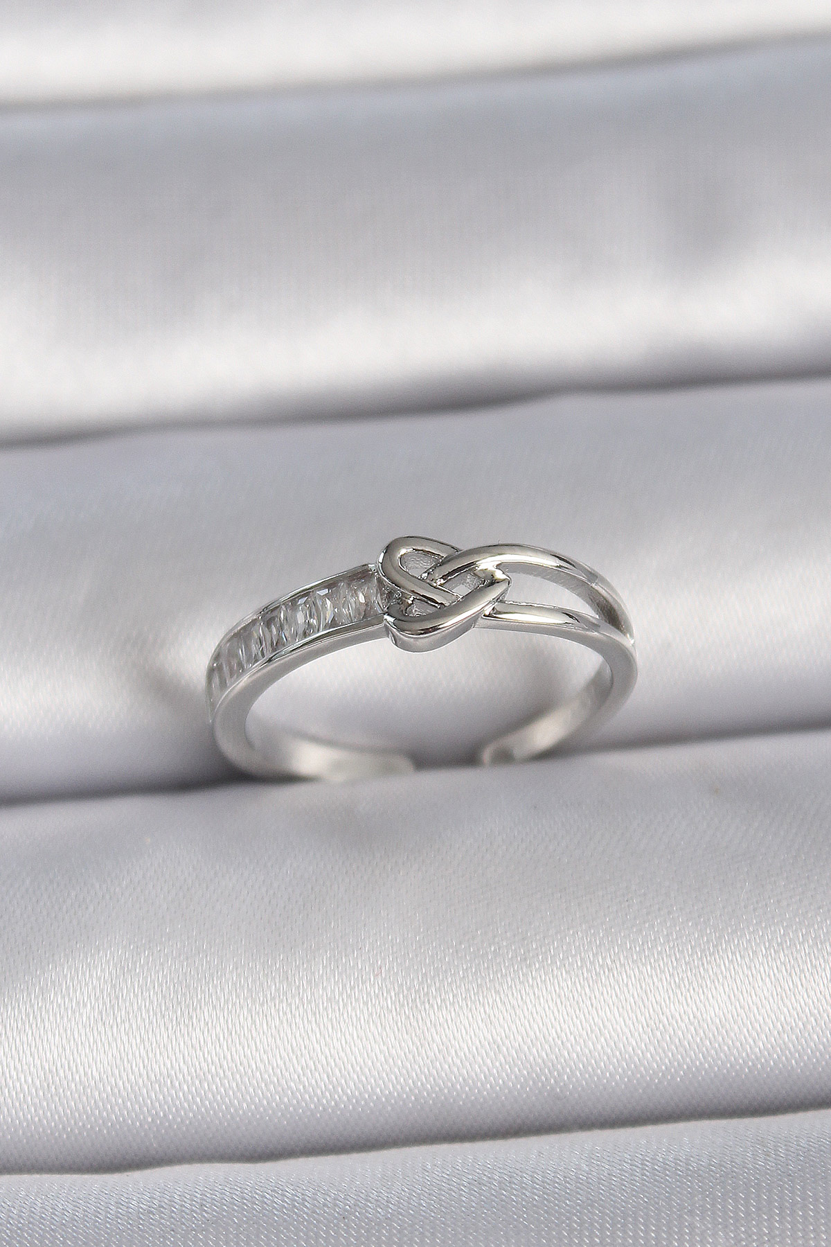 Pirinç Gümüş Renk Ayarlanabilir Zirkon Taşlı Düğüm Kalp Model Kadın Yüzük BYK3405
