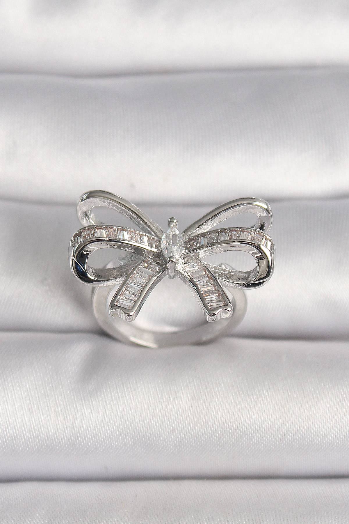 Pirinç Gümüş Renk Ayarlanabilir Zirkon Taşlı Kurdele Model Kadın Yüzük BYK3585