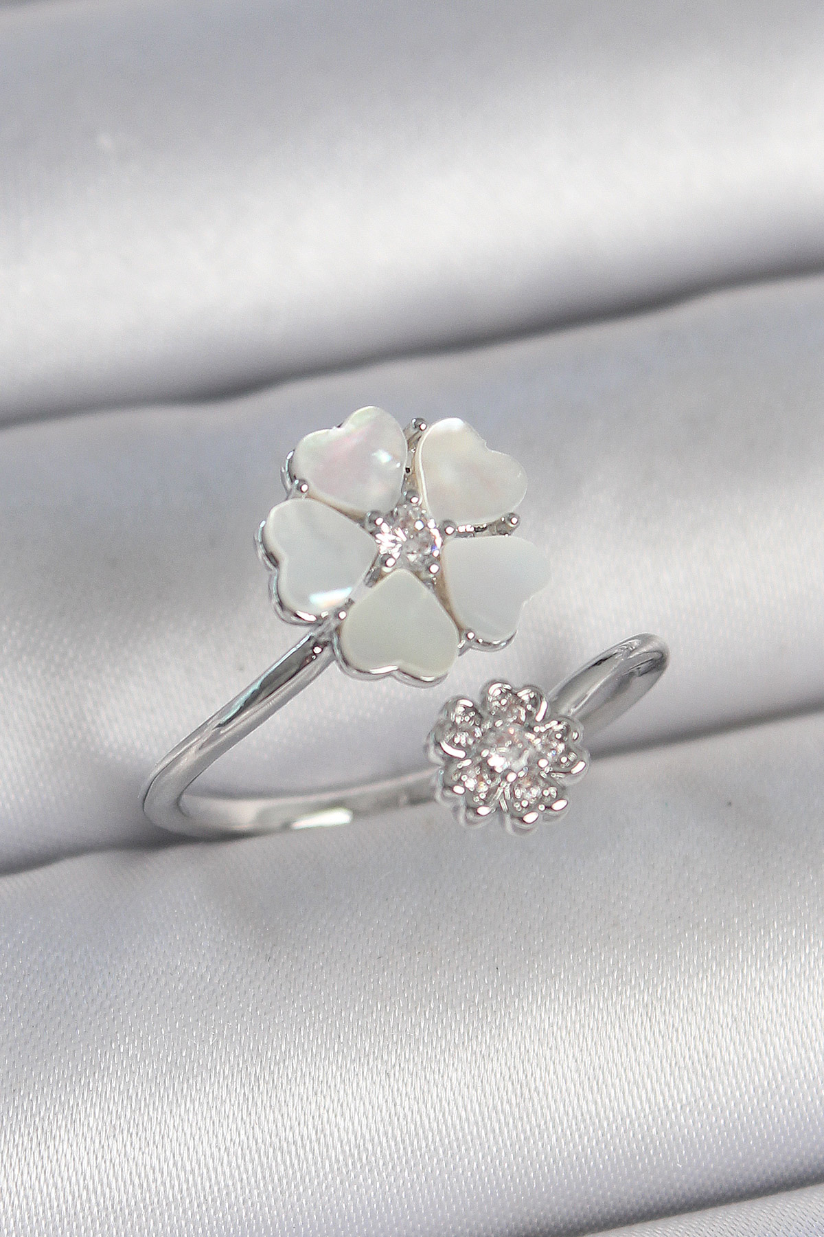 Pirinç Gümüş Renk Beyaz Mineli Çiçek Model Zirkon Taş Detay Kadın Yüzük BYK3712