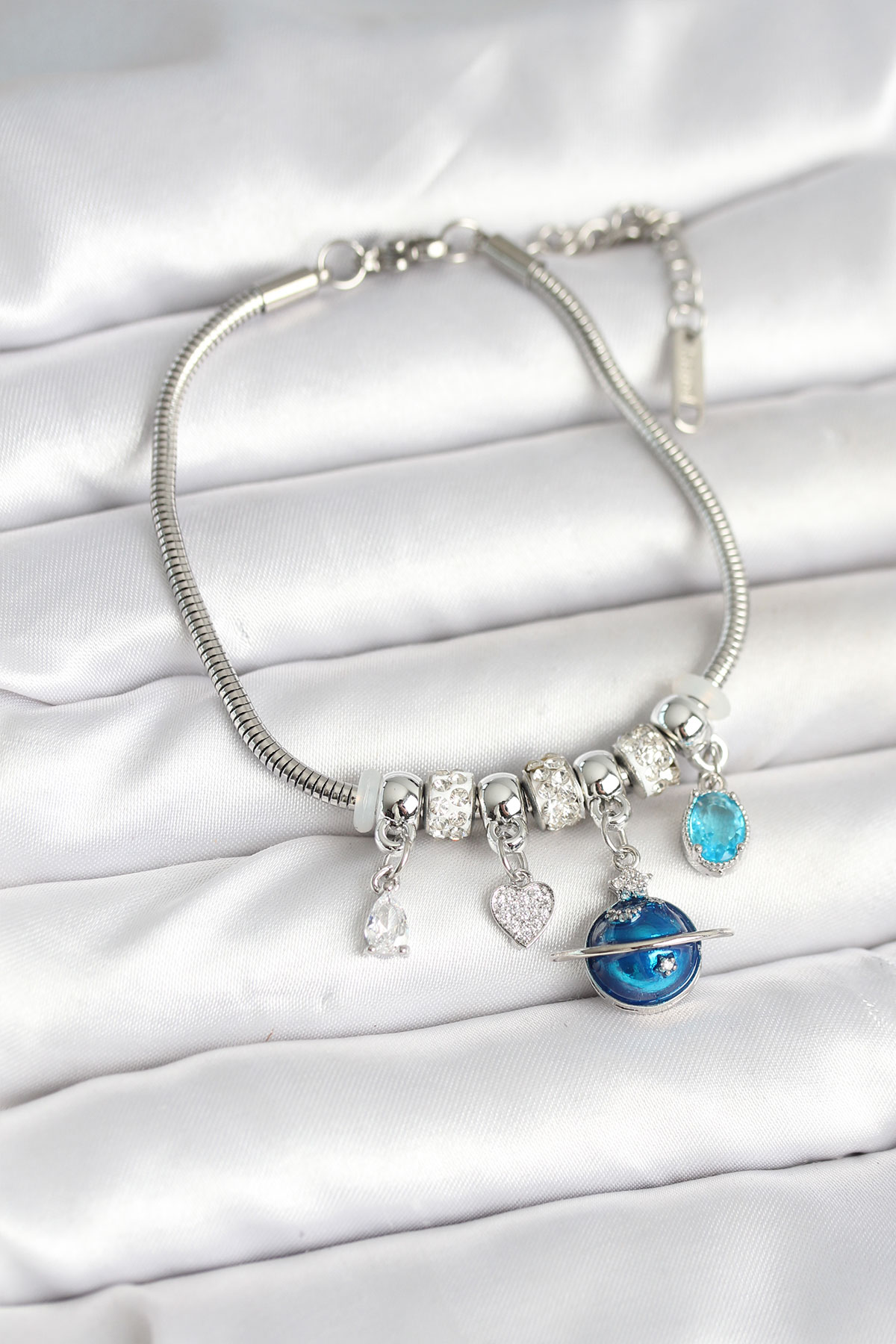 Pirinç Gümüş Renk Dünya Charmlı Kadın Bileklik BB7988