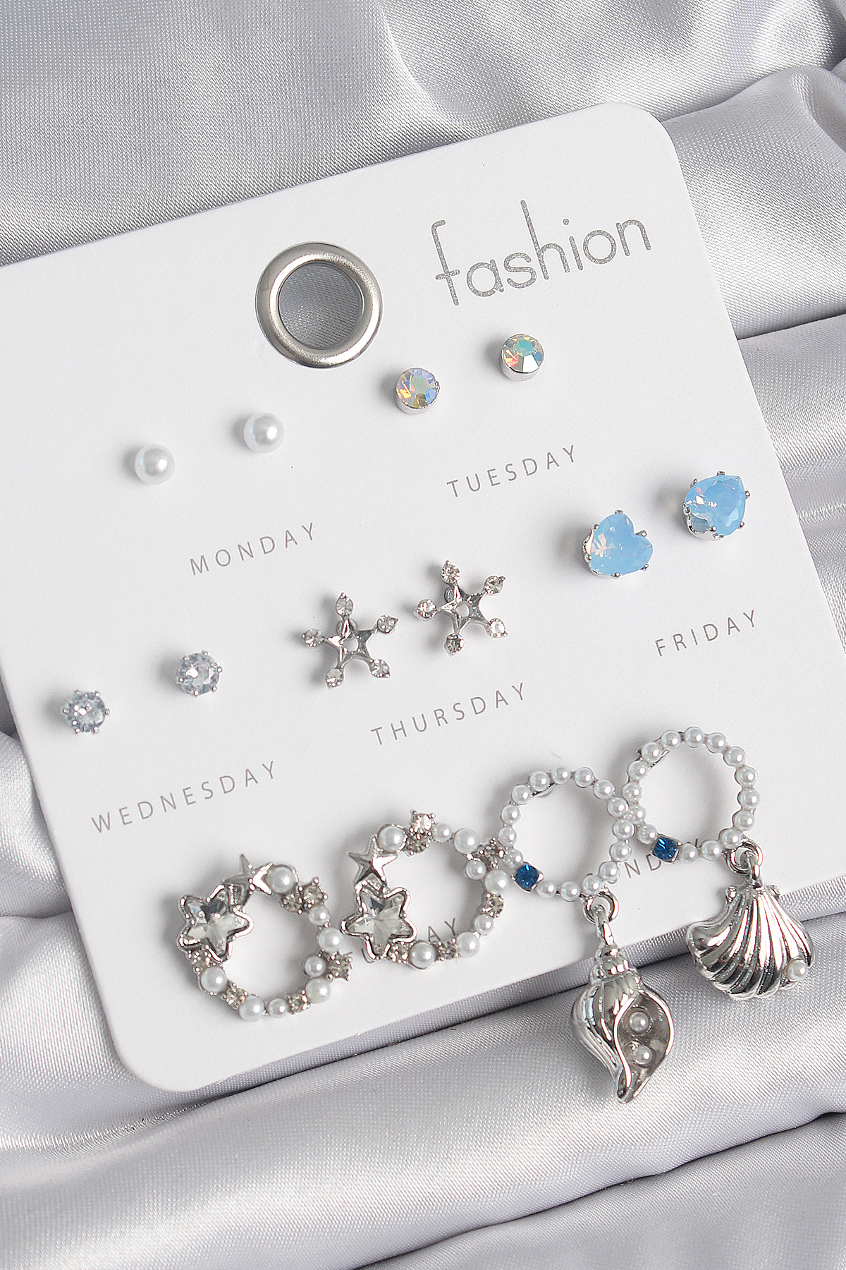 Pirinç Gümüş Renk İncli Zirkon Taşlı Halka Figür Yıldız Detay 7 Çift Kadın Küpe Seti BKP10547