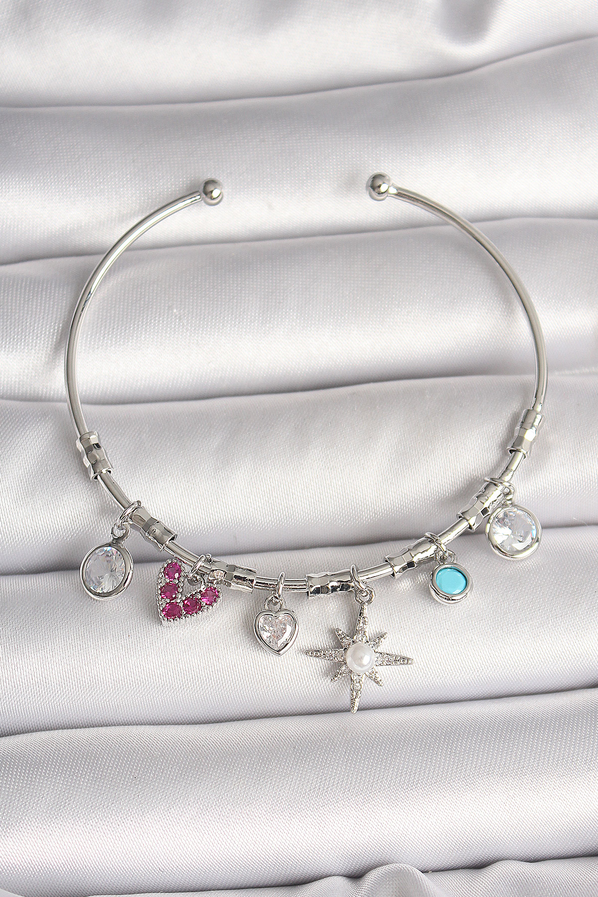 Pirinç Gümüş Renk Sallantı Zirkon Taşlı Kutup Yıldız Figür Kalp Detay Charm Kadın Bileklik BB6898