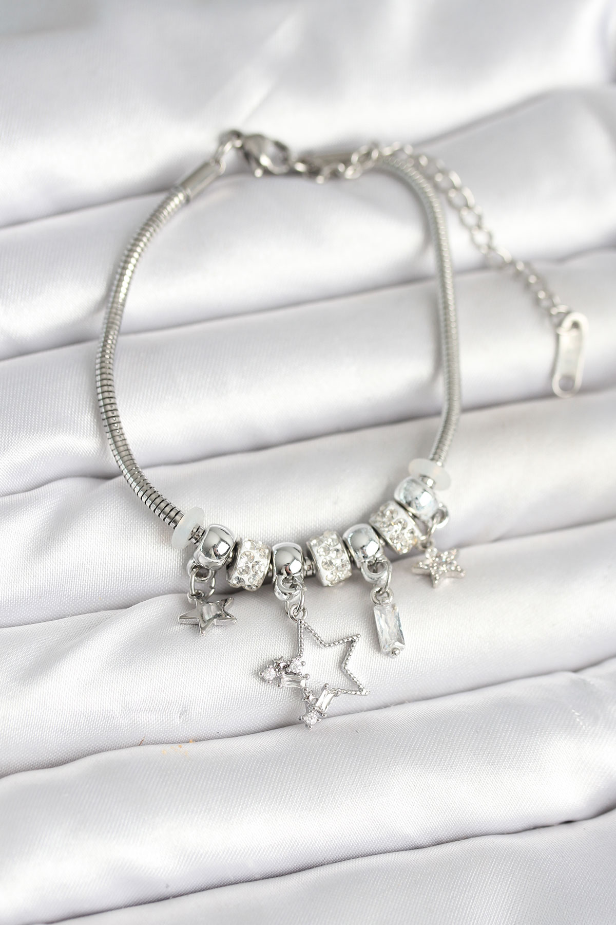 Pirinç Gümüş Renk Yıldız Charmlı Kadın Bileklik BB7994