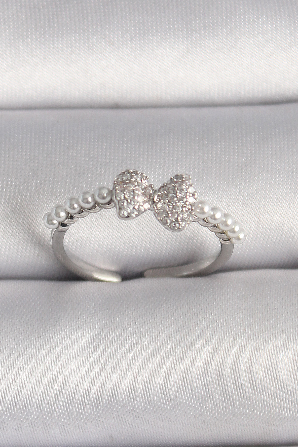 Pirinç Gümüş Renk Zirkon Taşlı Fiyonk İnci Detay Ayarlanabilir Yüzük BYK3526