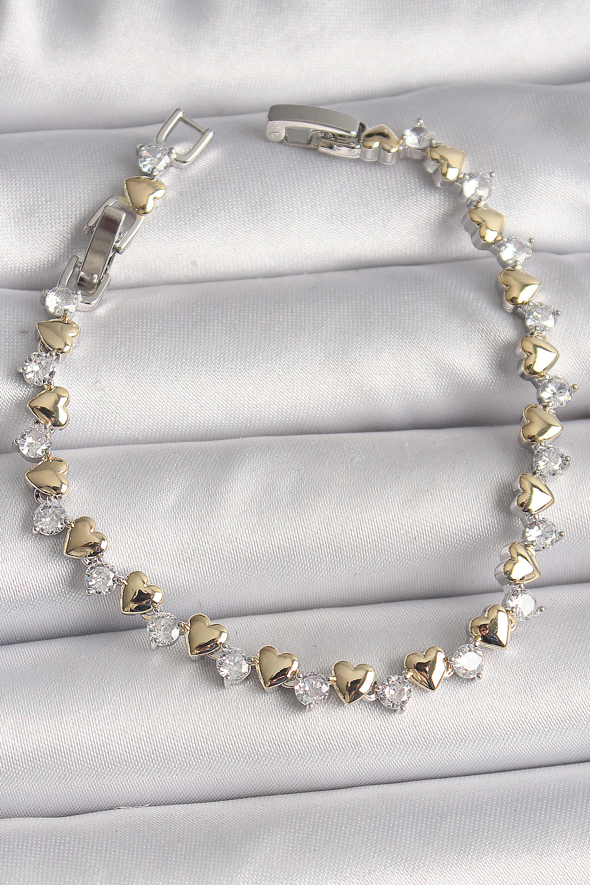 Pirinç Gümüş Renk Zirkon Taşlı Gold Kalpli VIP Seri Kadın Bileklik BB6714