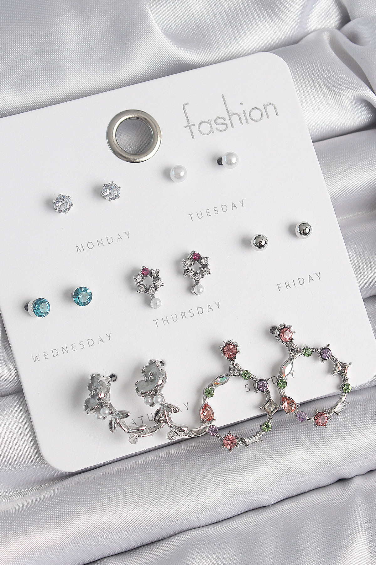 Pirinç Gümüş Renk Zirkon Taşlı Gül Figür Halka Model 7 Çift Kadın Küpe Seti BKP10544