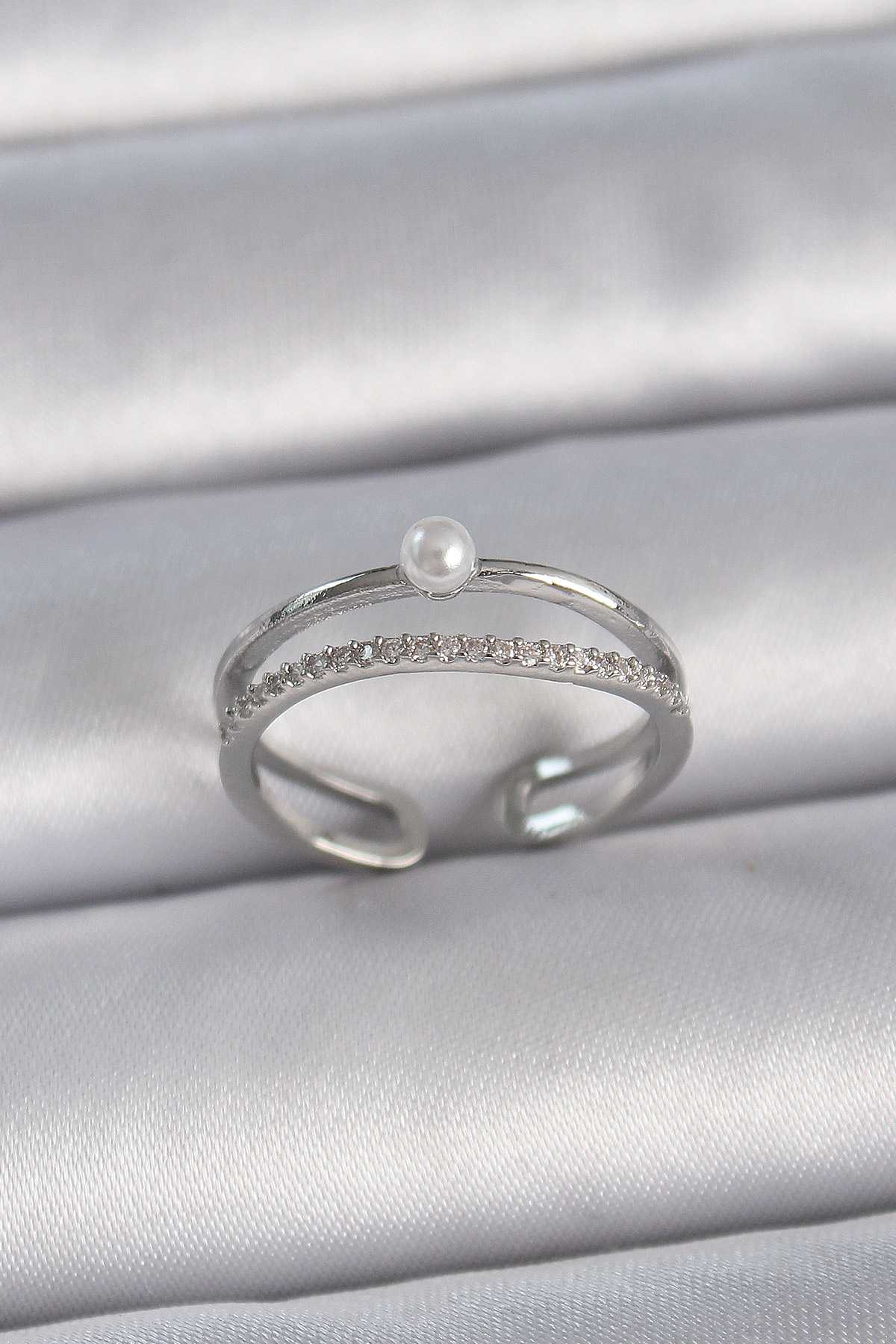 Pirinç Gümüş Renk Zirkon Taşlı İnci Detay Ayarlanabilir Model Kadın Yüzük BYK3371