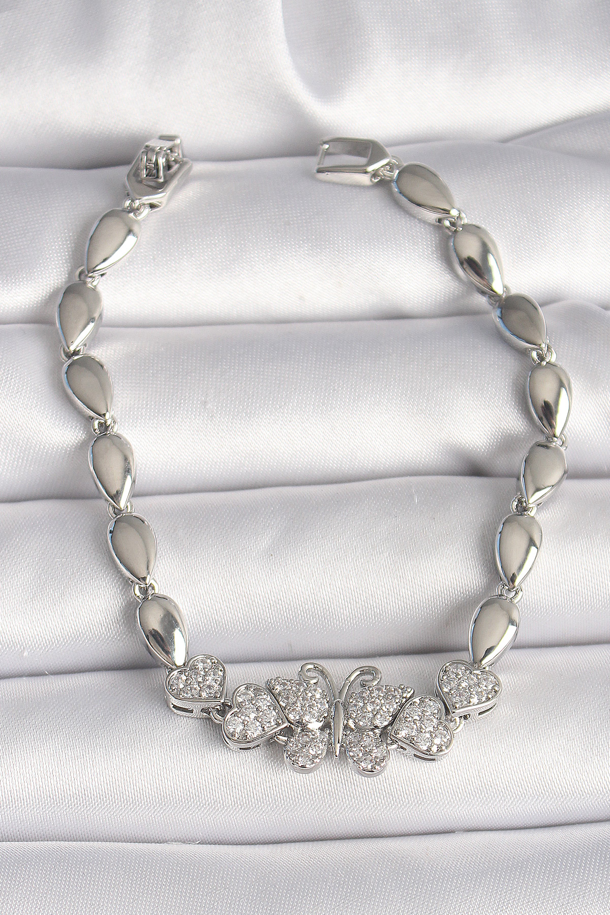 Pirinç Gümüş Renk Zirkon Taşlı Kelebek Figür Damla Zincir Model Kadın Bileklik BB6841