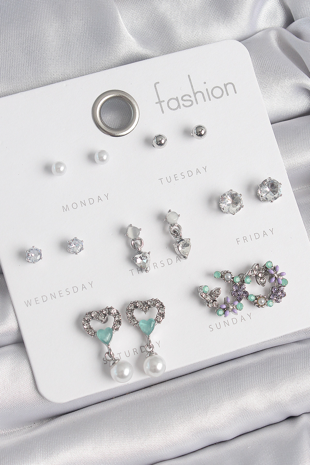 Pirinç Gümüş Renk Zirkon Taşlı Sallantılı Kalp Model Çiçek Detay 7 Çift Kadın Küpe Seti BKP10546