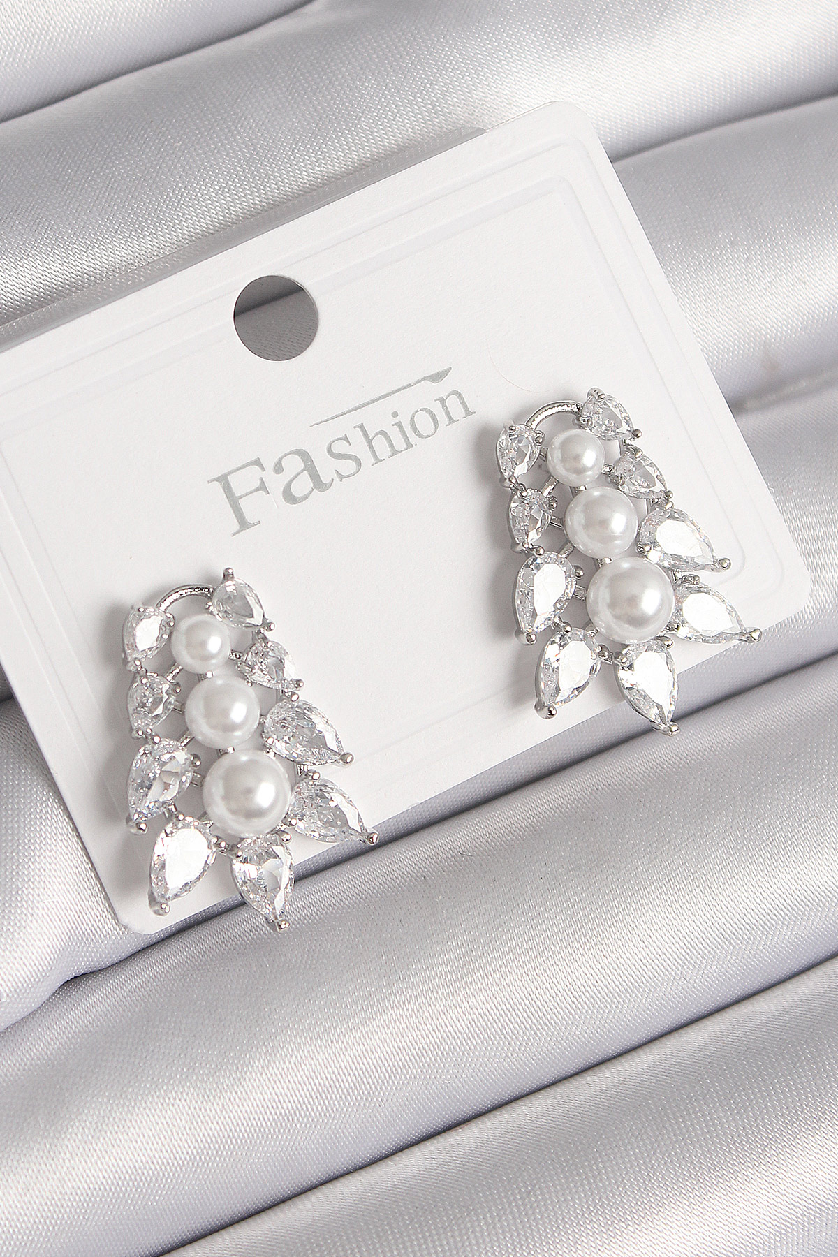 Pirinç Gümüş Renk Zirkon Taşlı Yaprak Model İnci Detay Kadın Küpe BKP9799