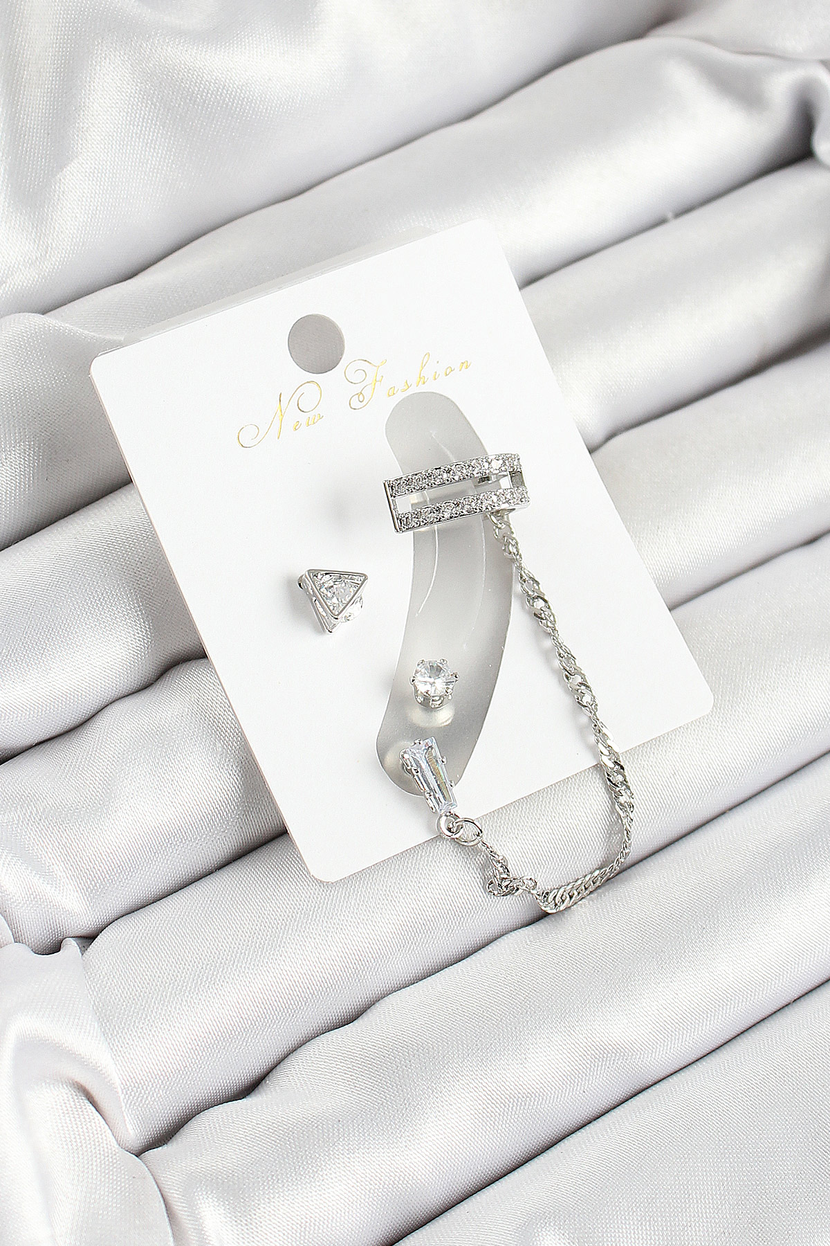 Pirinç Üçgen Figürlü Zirkon Taşlı Gümüş Renk 3’lü Kıkırdak Kadın Küpe Set BKP10658
