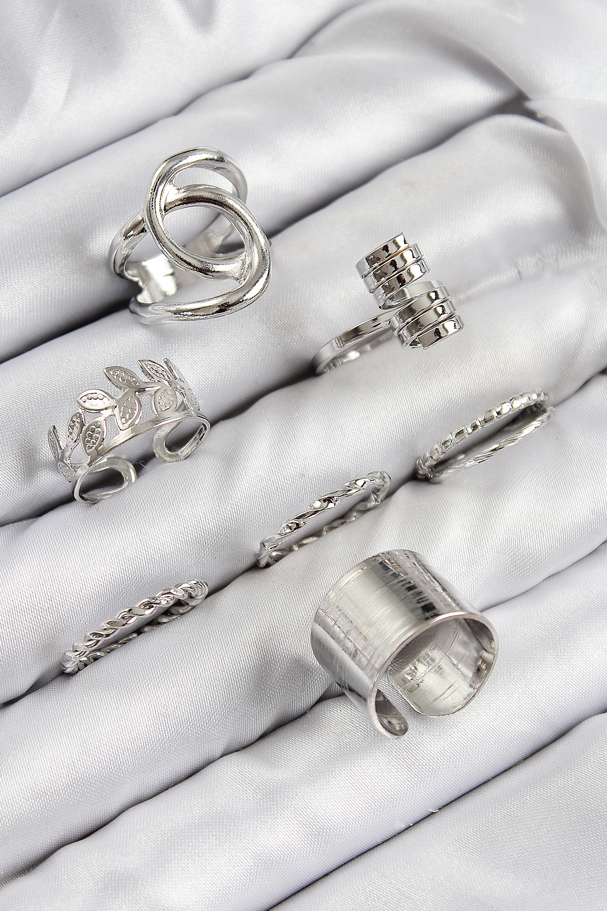 Pirinç Yaprak Model Gümüş Renk Kadın Yüzük Kombin Set BYK3818