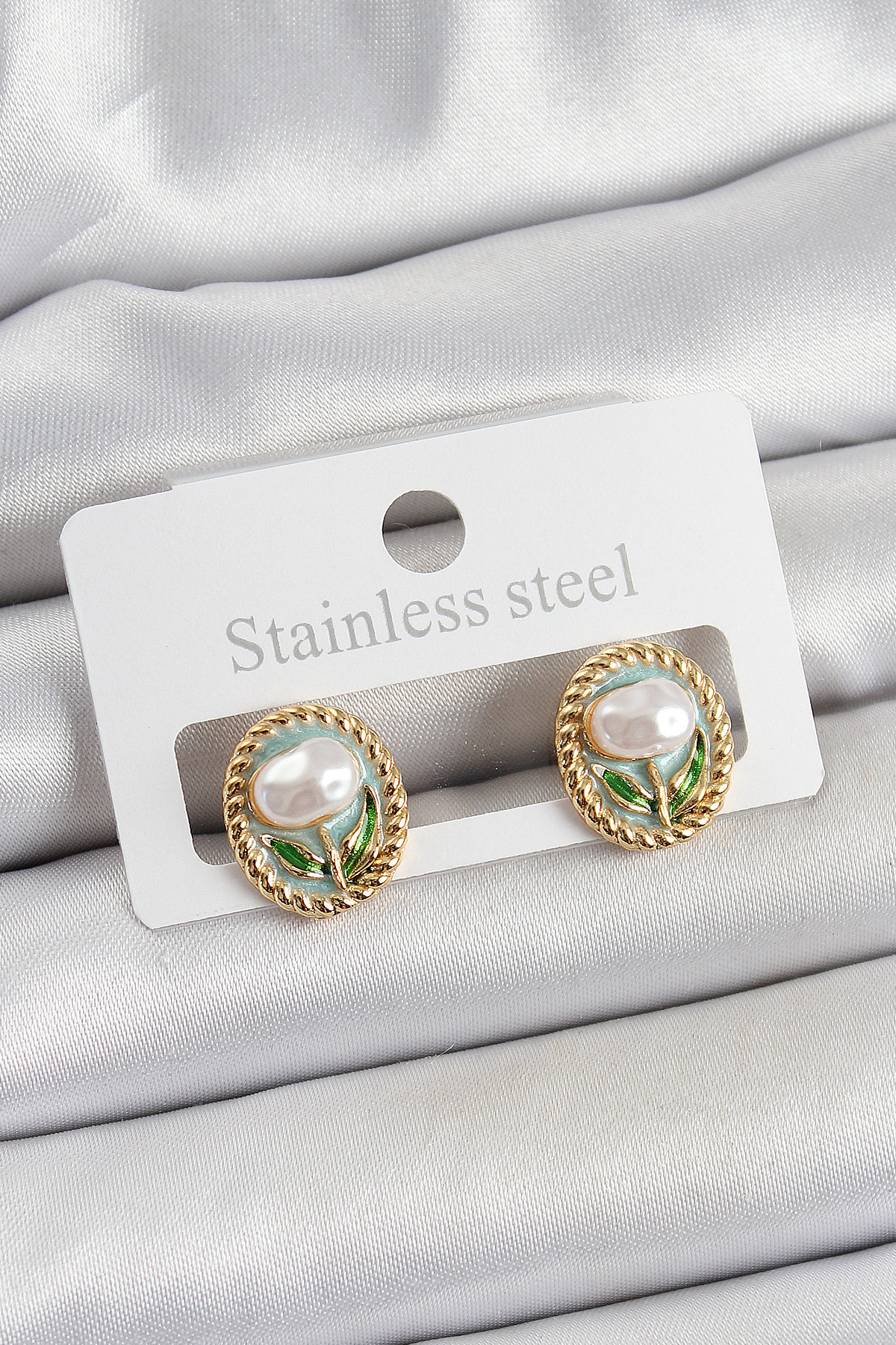 Pirinç Yeşil Mineli Lale Figürlü Sanatsal Portre Model Gold Renk Kadın Küpe BKP10673