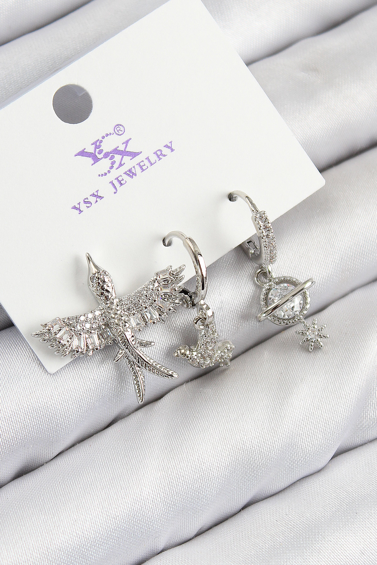 Pirinç Zirkon Taşlı 3’lü Kuş Model Gümüş Renk Kadın Küpe BKP11124