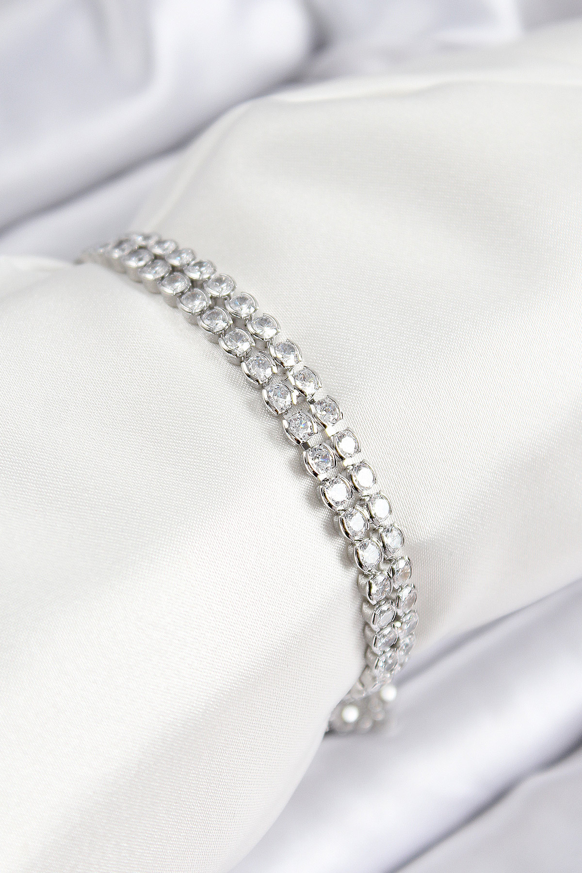Pirinç Zirkon Taşlı Çift Sıra Model Gümüş Renk Asansörlü Kadın Bileklik BB7738
