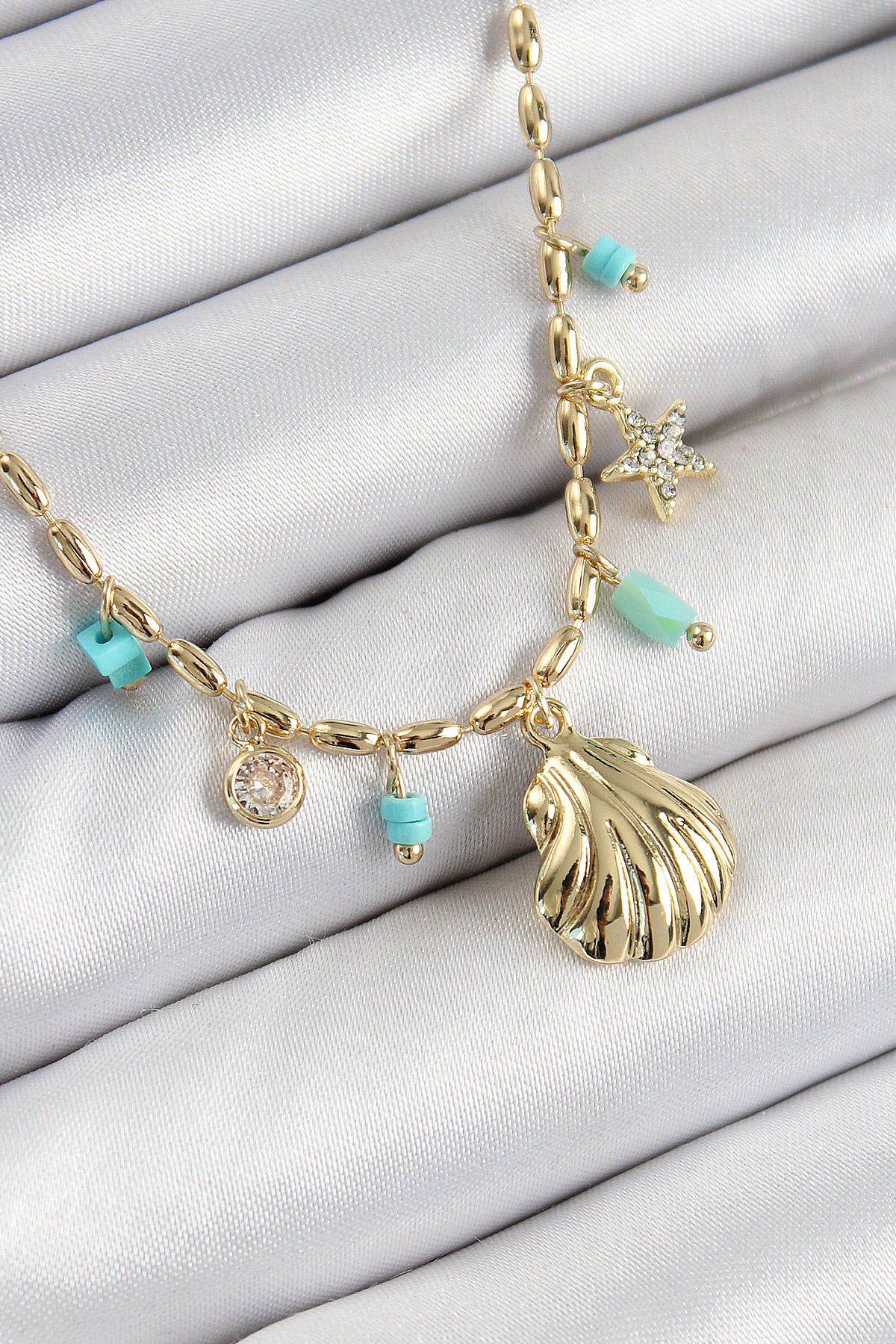 Pirinç Zirkon Taşlı Deniz Kabuğu Model Gold Renk Kadın Kolye BKO10368