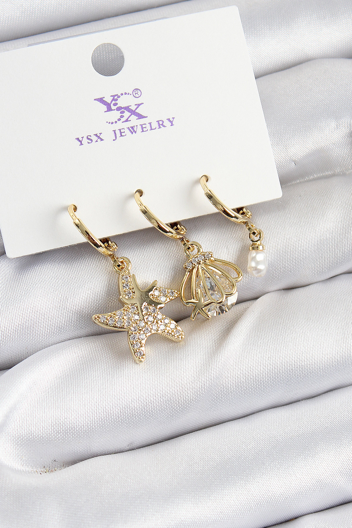 Pirinç Zİrkon Taşlı Deniz Yıldızı Ve İstiridye Model Gold Renk 3’lü Kadın Küpe BKP10944