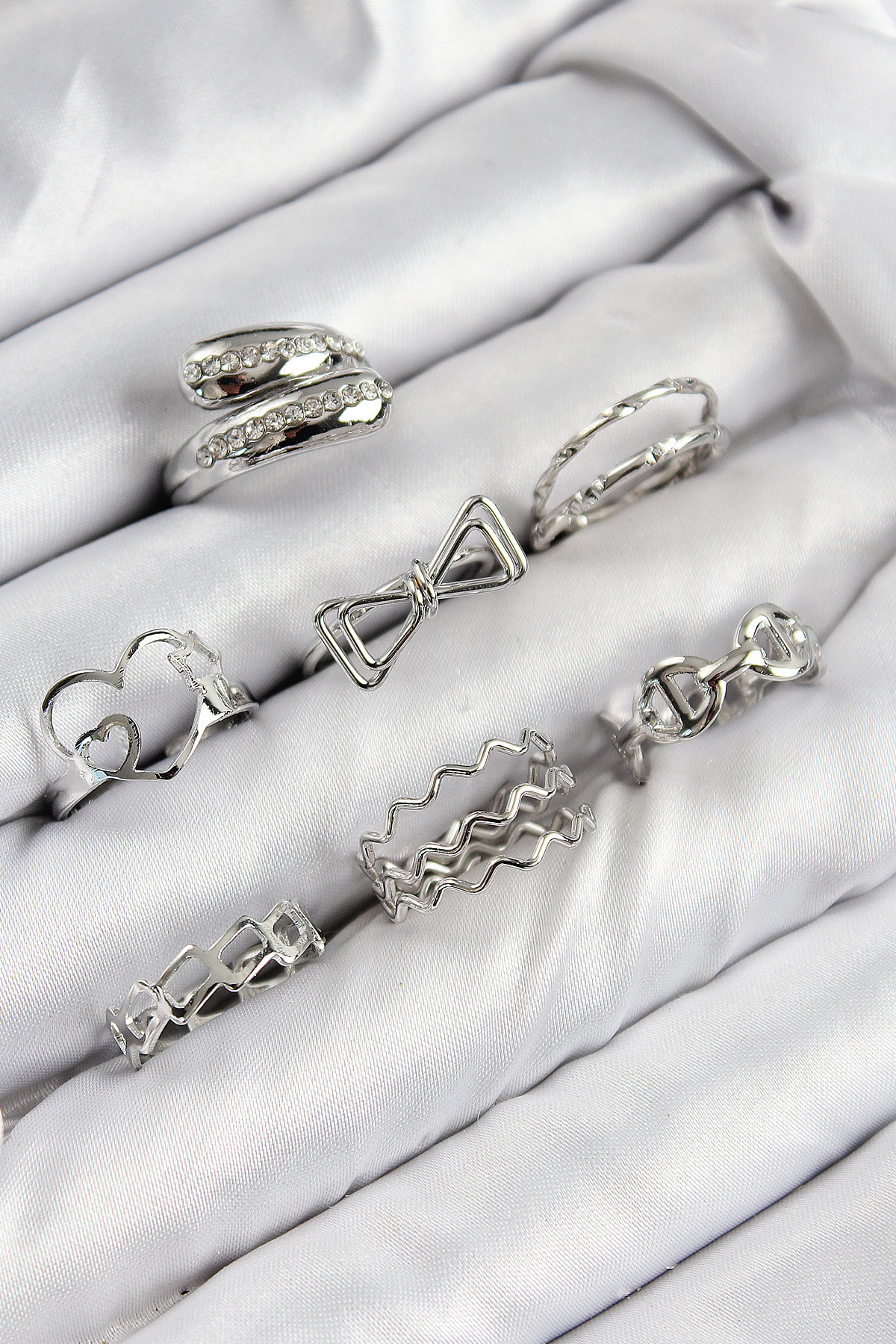 Pirinç Zirkon Taşlı Fiyonk Ve Kalp Model Gümüş Renk Kadın Yüzük Kombin Set BYK3822