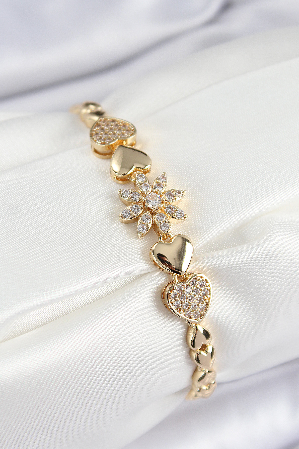 Pirinç Zirkon Taşlı Kalp Detaylı Çiçek Model Gold Renk Kadın Bileklik BB7527